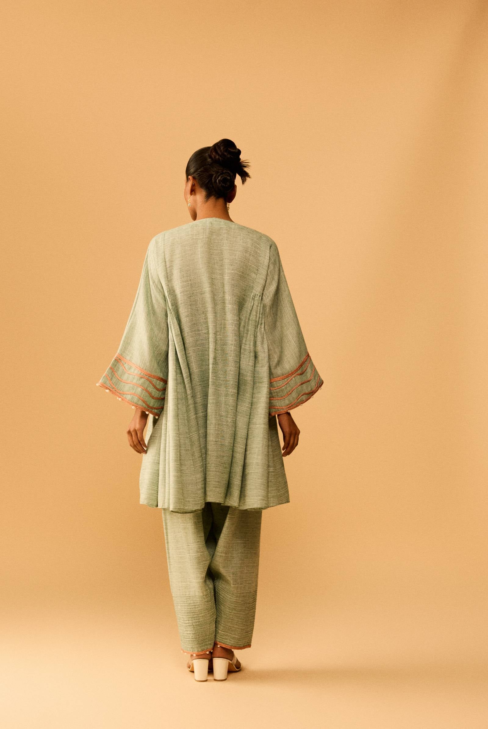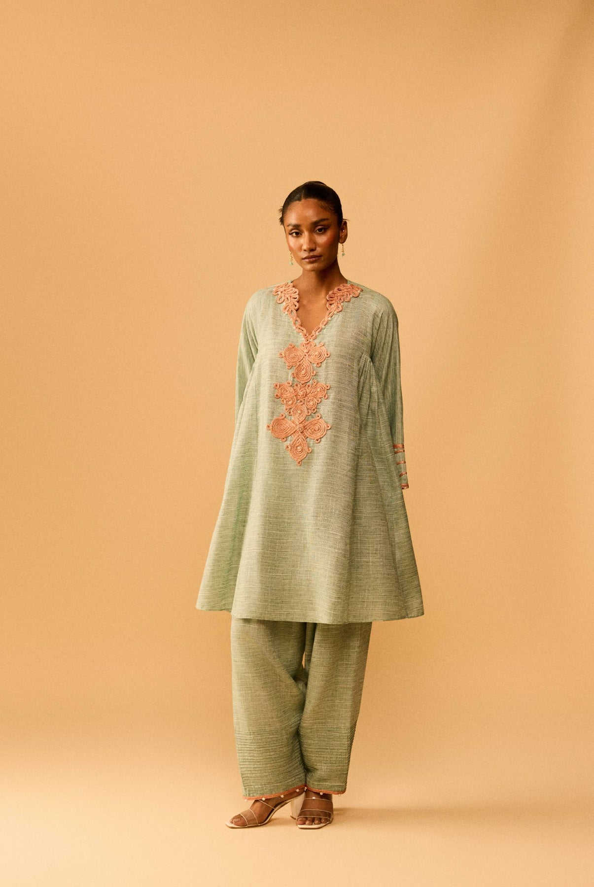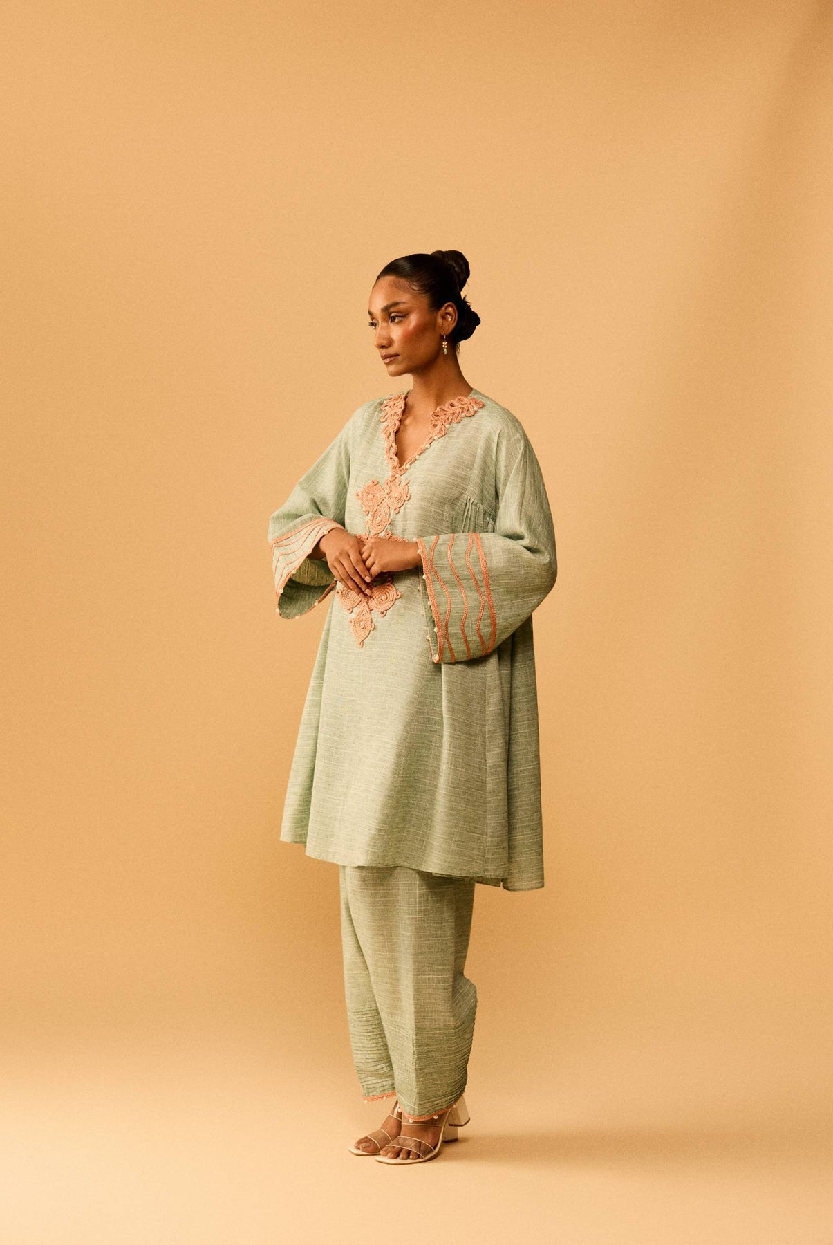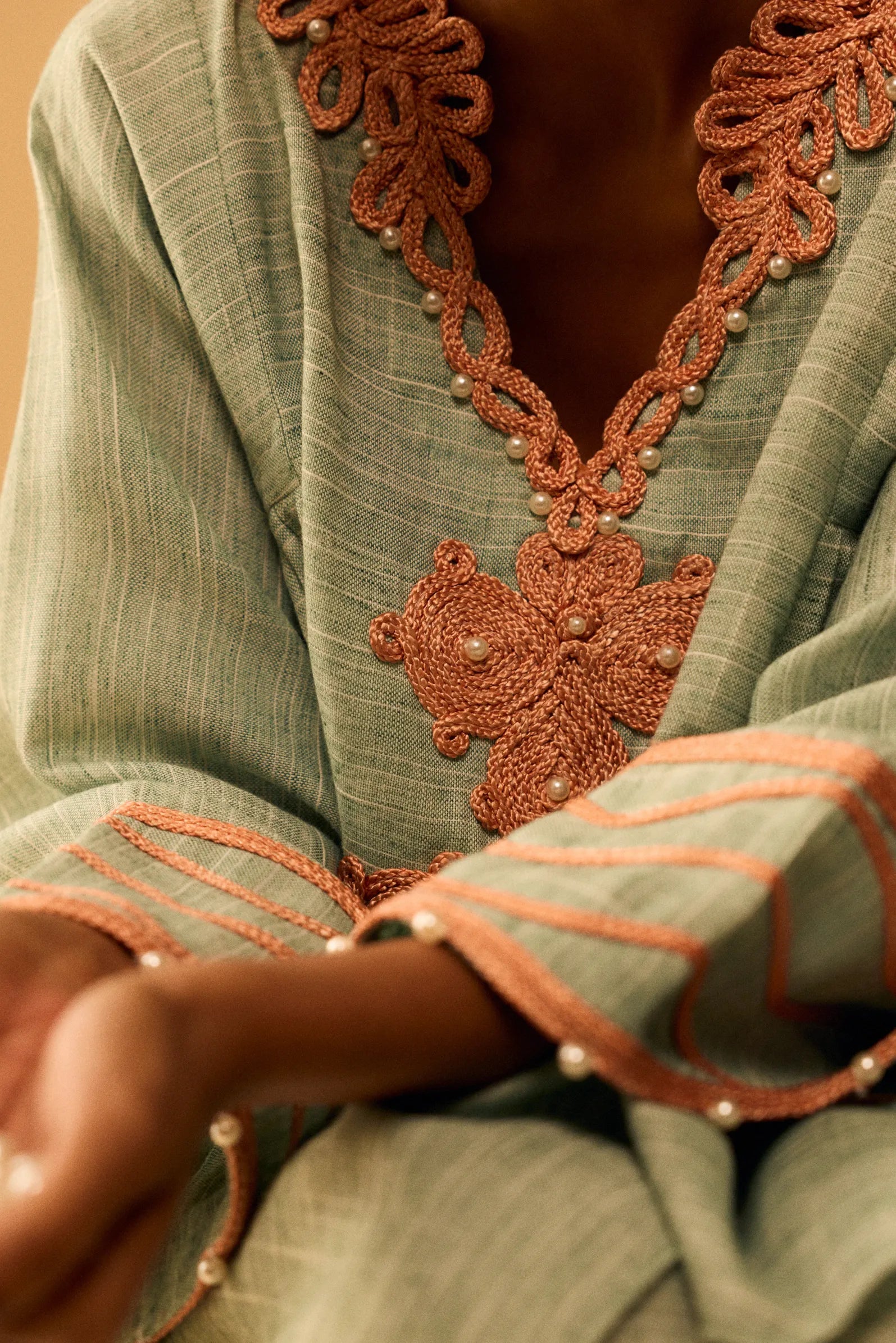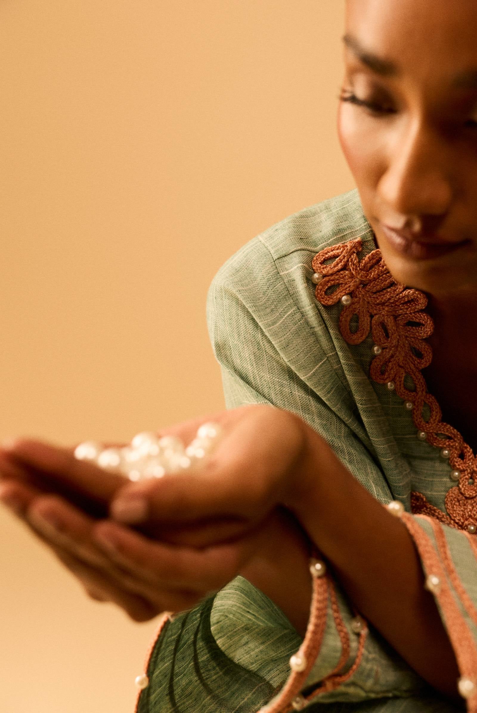There’s something about sage green that makes celebration feel calmer. I’m the Ac-cord-ingly Festive Kediya Kurta Set in sage green—tailored for celebrations that favour ease over excess. My deep V-neckline is traced with fine embroidery and pearl accents that feel subtle but special. The soft-contrast detailing and fluid sleeves give me a fresh, modern heritage charm—something that feels just as right at a garden brunch as it does at a festive gathering.