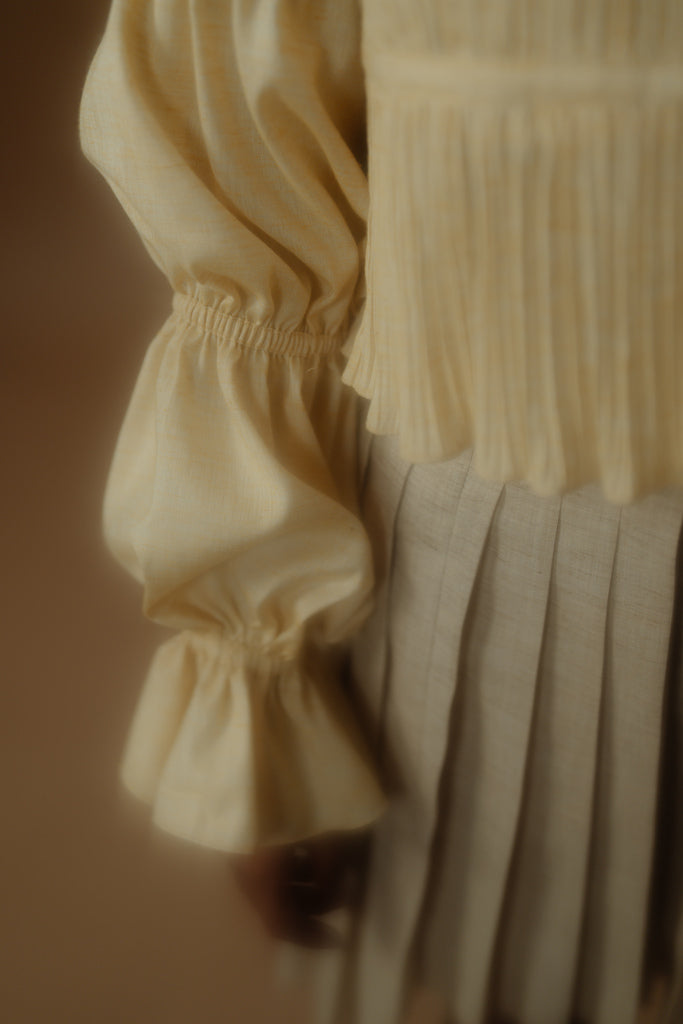 I am what you feel when you watch the sun rise or set on a beautiful day. I am a mood any way you wear me. Whether it’s as a set, or mixed and matched with other hued favourites. Composed of a unique three layered top, ruched to create a chic texture — the layers fall in a way that will flatter any body, and every mood. Add to it my three layered balloon sleeves and you know I am all about having a good time. I look best with my high-low skirt — a handcrafted creation that is contemporary, edgy and cool. It is made from a luxurious pleated-textured soft linen fabric that falls like butter on the skin. Together, my silhouette is striking, and promises uncomplicated comfort every step you take, every move you make.