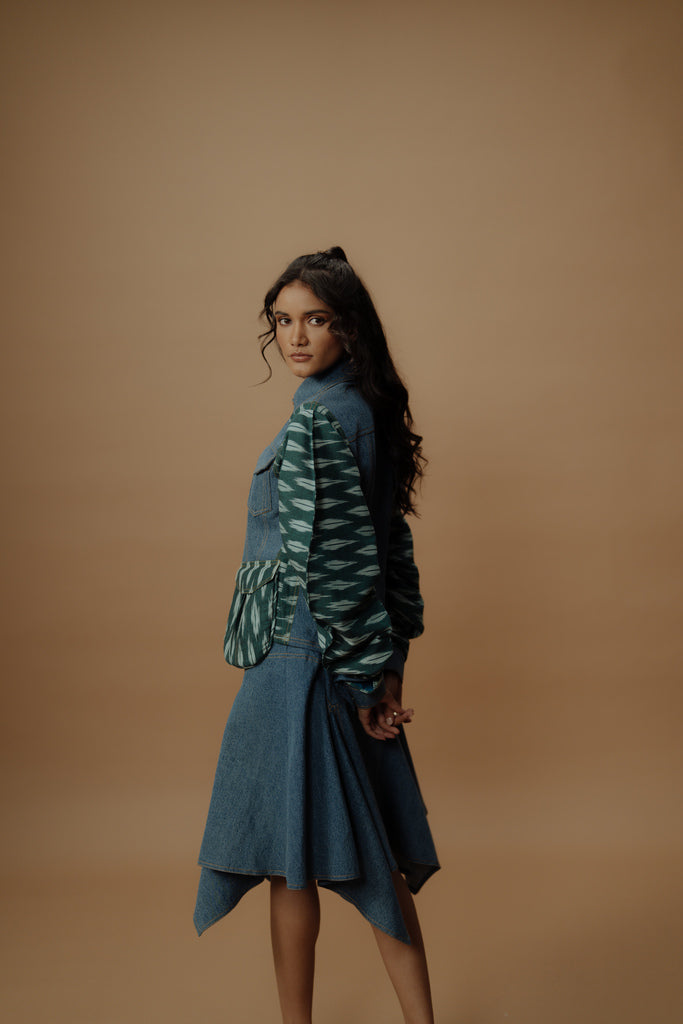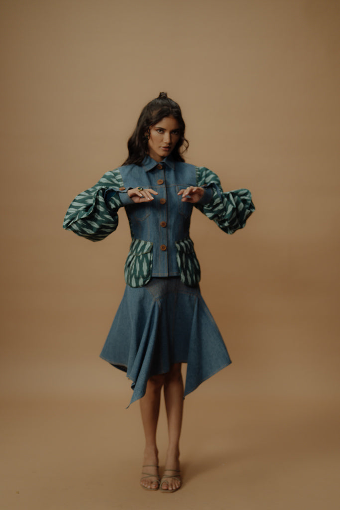 I am what you feel when you push your boundaries, step out of your comfort zone and embrace the limitless possibilities of life. I am a modern classic masterpiece that blends tradition with innovation and style with substance. I am a fit-and-flare skirt, cut from a luxe denim. The skirt features panels that create a structured fit at the waist, flowing seamlessly into a flattering, feminine flare. My large wooden buttons make me pretty cool too. I’ll make sure you push your style boundaries and embrace the amazing. Wear me and you’ll see.