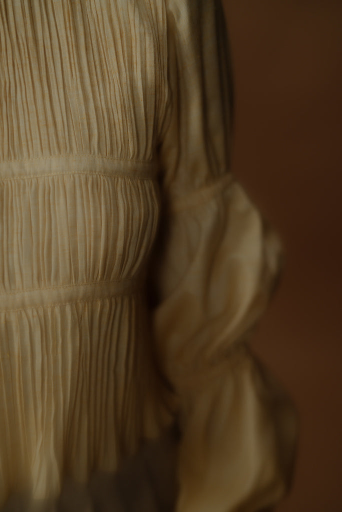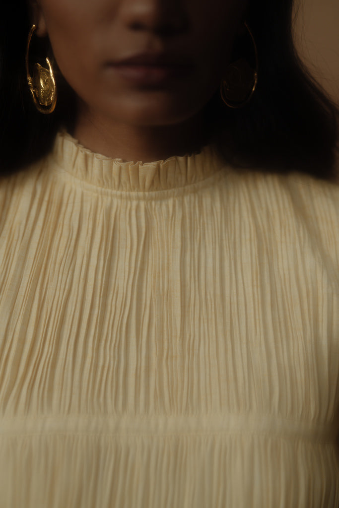 I am what you feel when you watch the sun rise or set on a beautiful day. I am a mood any way you wear me. I am a unique three layered top, ruched to create a chic texture — the layers fall in a way that will flatter any body, and every mood. Add to it my three layered balloon sleeves and you know I am all about having a good time.