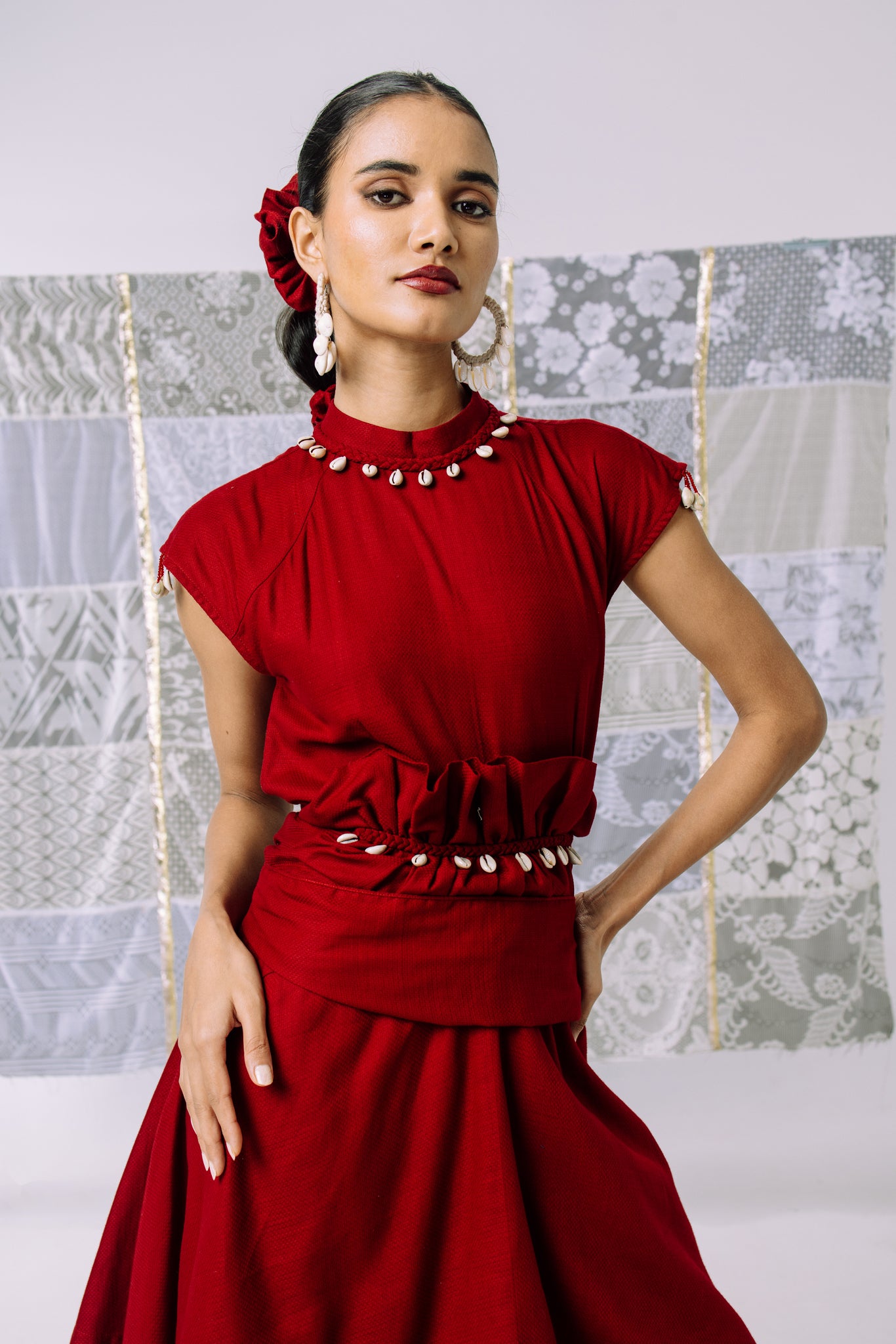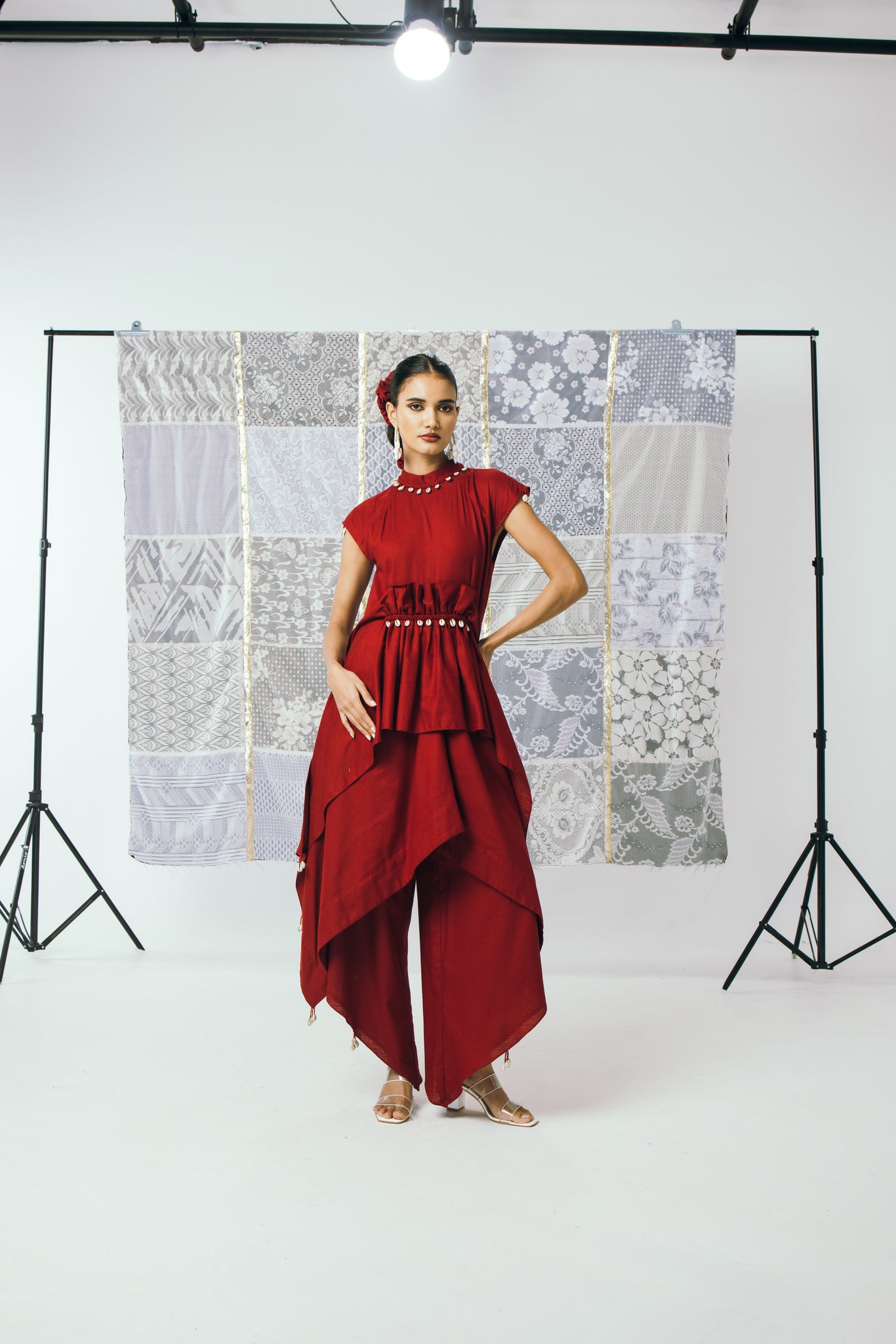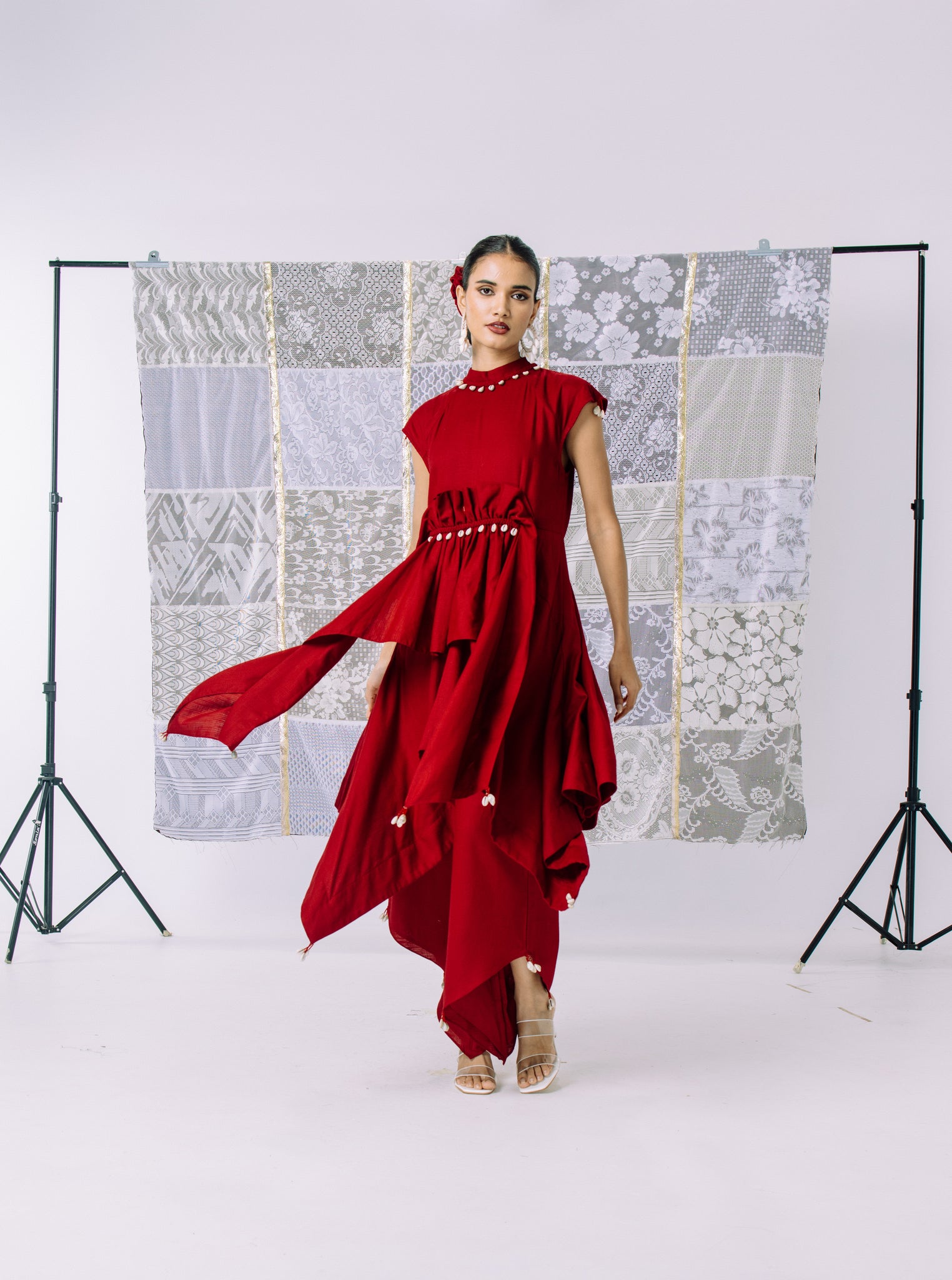 I’m in my “radiance era”, where festive wear becomes a celebration of fun, brightness, and boldness. My silhouette? A stunning long high-low asymmetrical handkerchief-style kurta, paired with a matching asymmetrical V-flared pant that dances with every step. I carry a nostalgic, vintage charm, thanks to my varied-length panels that make every turn a moment of diva-like grace. Crafted from a soft cotton blend in a rich, deep red hue, I exude warmth and vibrance. My cap sleeves add a playful touch, while my handcrafted kodi shell work, with red glass beads, brings a dash of artisanal elegance. My high neck, featuring a braided fabric detail, ties it all together. Chic, radiant, and effortlessly modern, I’m the classic piece you’ll reach for to light up any festive occasion this season.