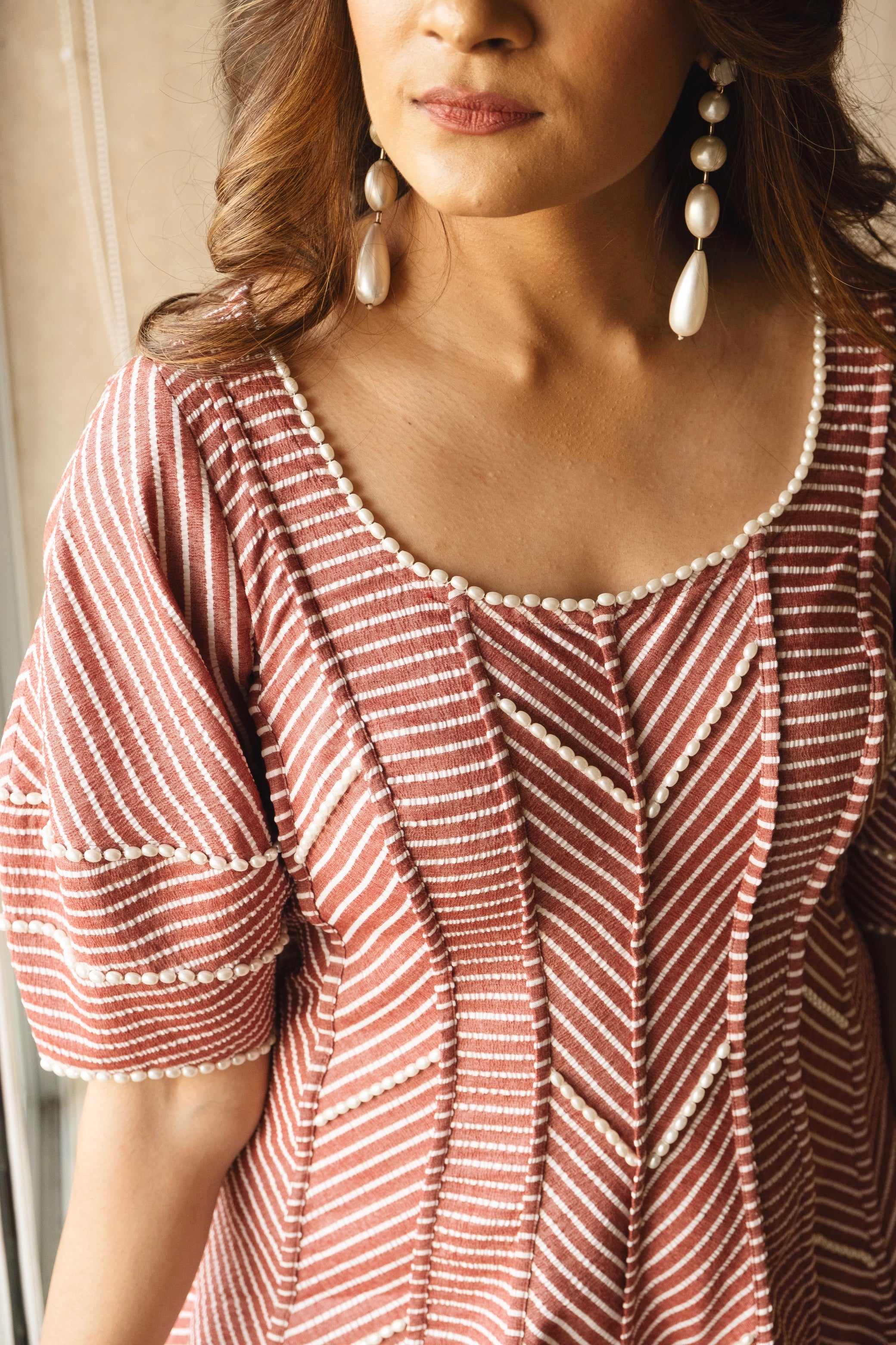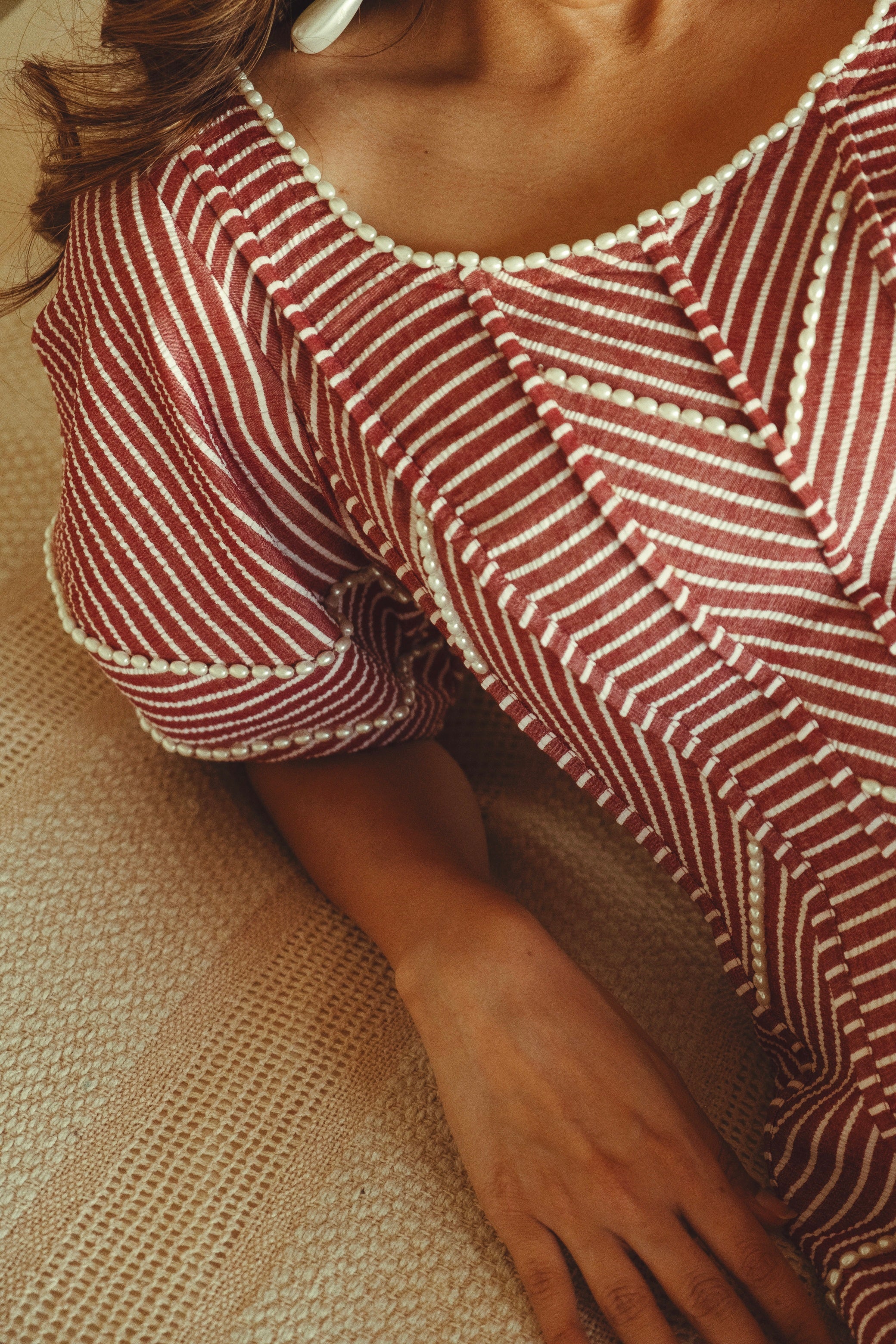 I'm the "Lovestruck Dress," a dress that demands love at first sight. My red-striped panels are thoughtfully designed to create a flattering A-line silhouette that gently flares from the bust, offering both comfort and elegance. Each panel is meticulously crafted with stripes arranged in intriguing V patterns, connected by horizontal lines, creating a slimming illusion that's both captivating and unique. The addition of fabric piping highlights my structure, while delicate oval pearls adorn these V's, adding a touch of sophistication. My sleeves are a contemporary take on the puff style, featuring a thick band embellished with pearls, ensuring I stand out in any setting.
