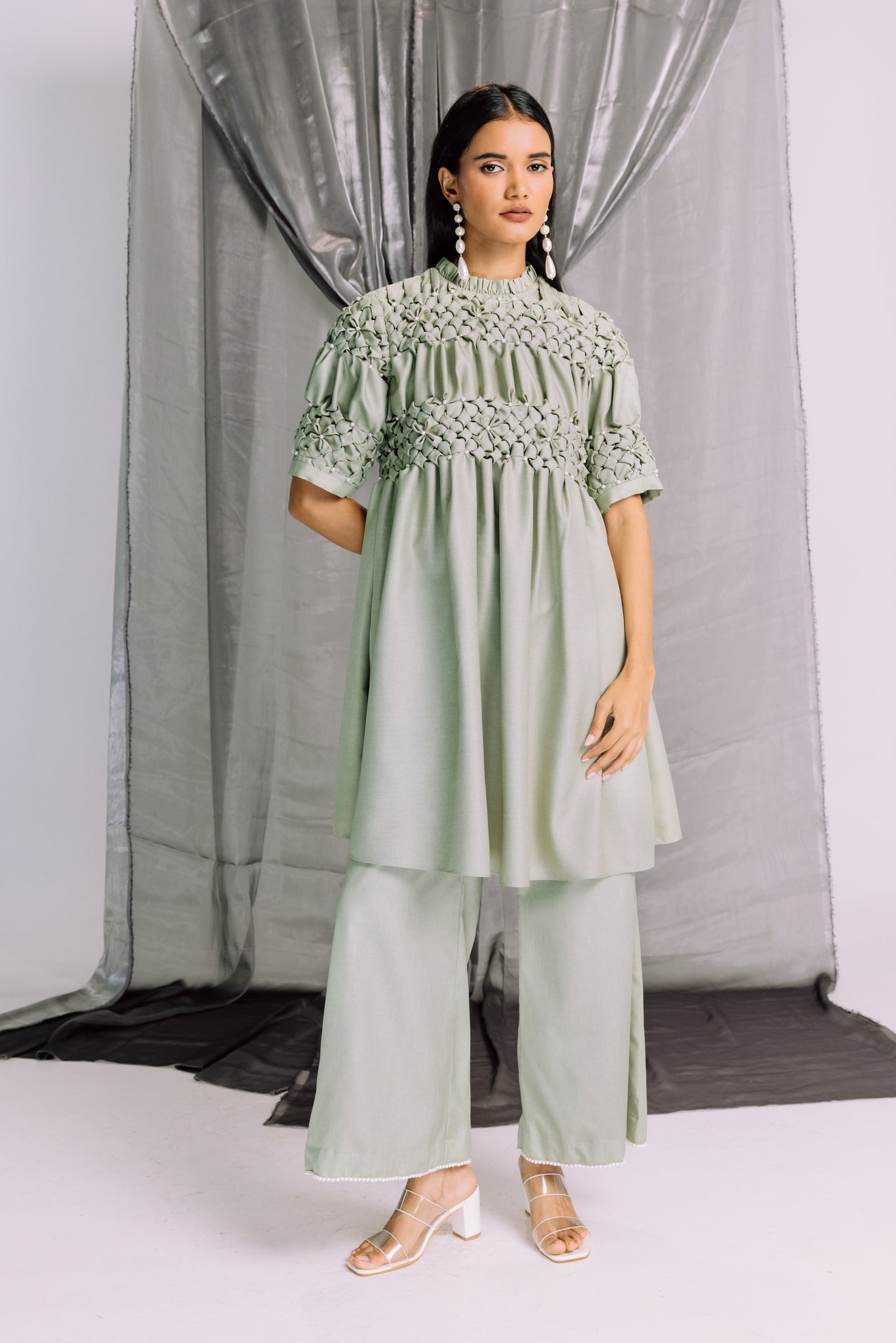 I’m living my “vintage modern girly” era, embodying a style icon wherever I go, ready to celebrate life’s joys and festivities. Crafted with care, I come in two stunning versions — a deep, dark blue round-neck long dress or a delicate sage green high-neck dress with ruffle details. My classic silhouette is straight cut, but don’t be fooled by my simplicity; the gathered fabric gives me a graceful, flared appearance that’s anything but ordinary. What truly sets me apart is my intricate smocking, a labor of love by our skilled karigars. Each piece takes approximately 70 hours to perfect, with dots applied meticulously on the reverse side, guiding the hand-gathered fabric into a unique, deconstructed pattern. This isn’t just embroidery — it’s an art form that turns every inch of me into a masterpiece.