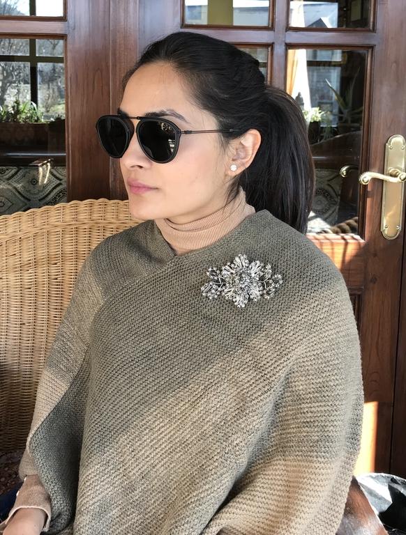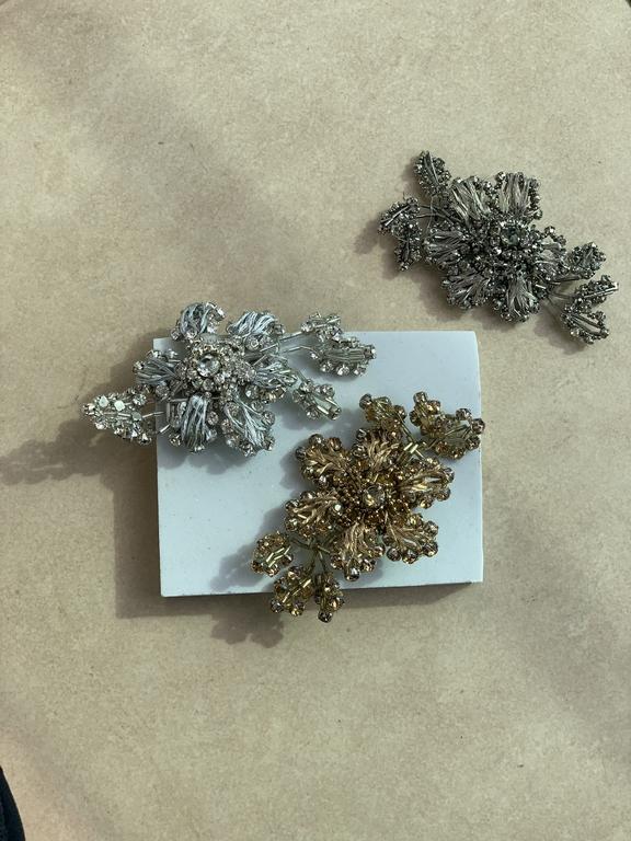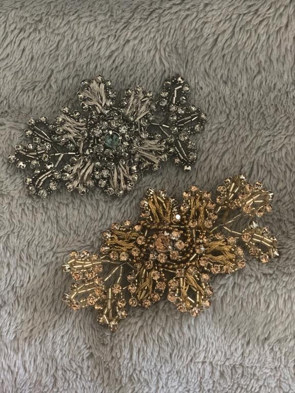 i am one of the most versatile hand embroidered brooches. i am larger than your average brooch — measure 4x2. 5 inches. i am made out of high quality crystal stones, metallic threads and bugle beads wired together. my back has an artificial leather finish. i have a pin that will secure me onto many canvases.