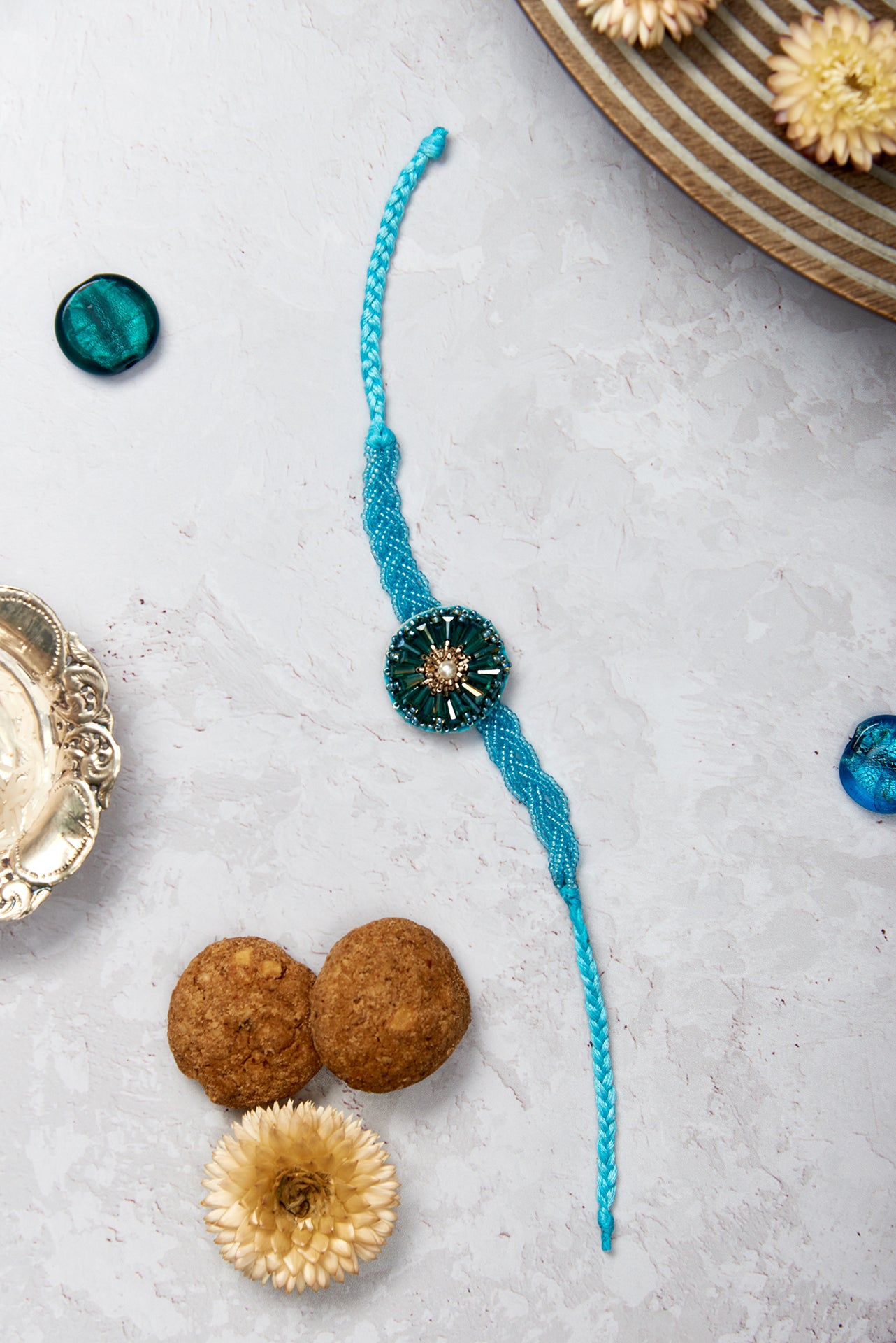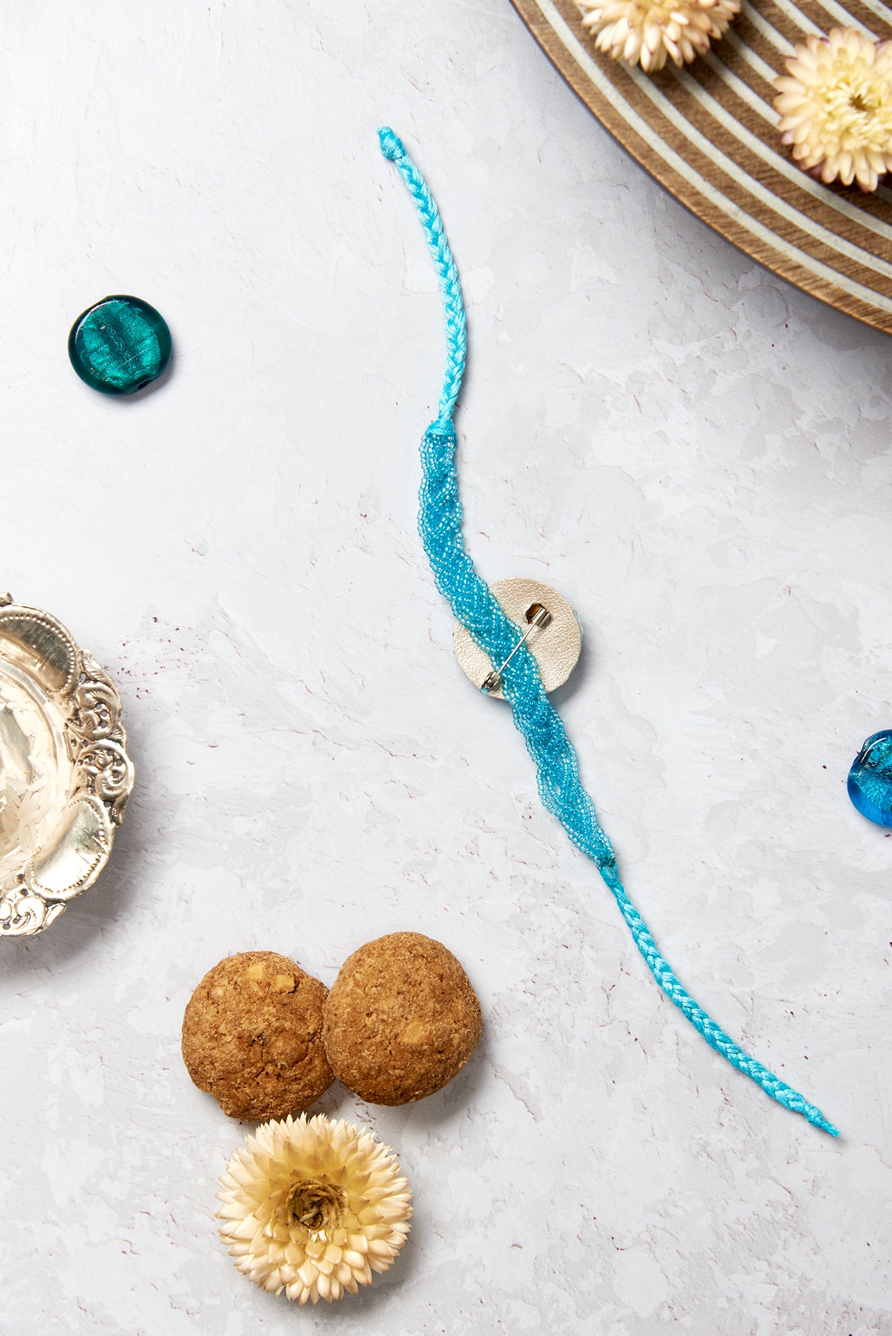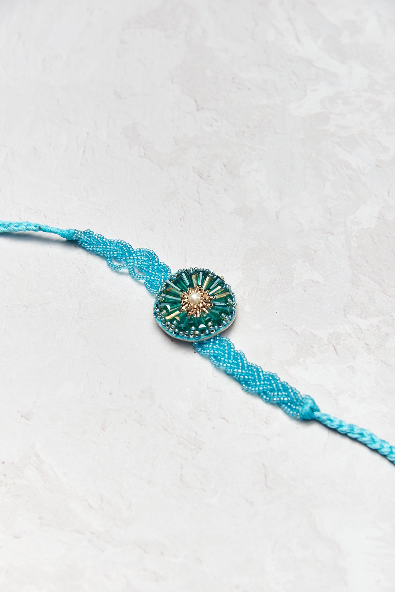 i am a beautiful hand embroidered rakhi with a mini brooch that is detachable. i feature a hand embroidered beaded band. i am made in a stunning turquoise colour and really one of a kind, just like your bro. the back of my mini detachable brooch has an artificial leather finish. it also has a pin that will secure me onto many canvases.