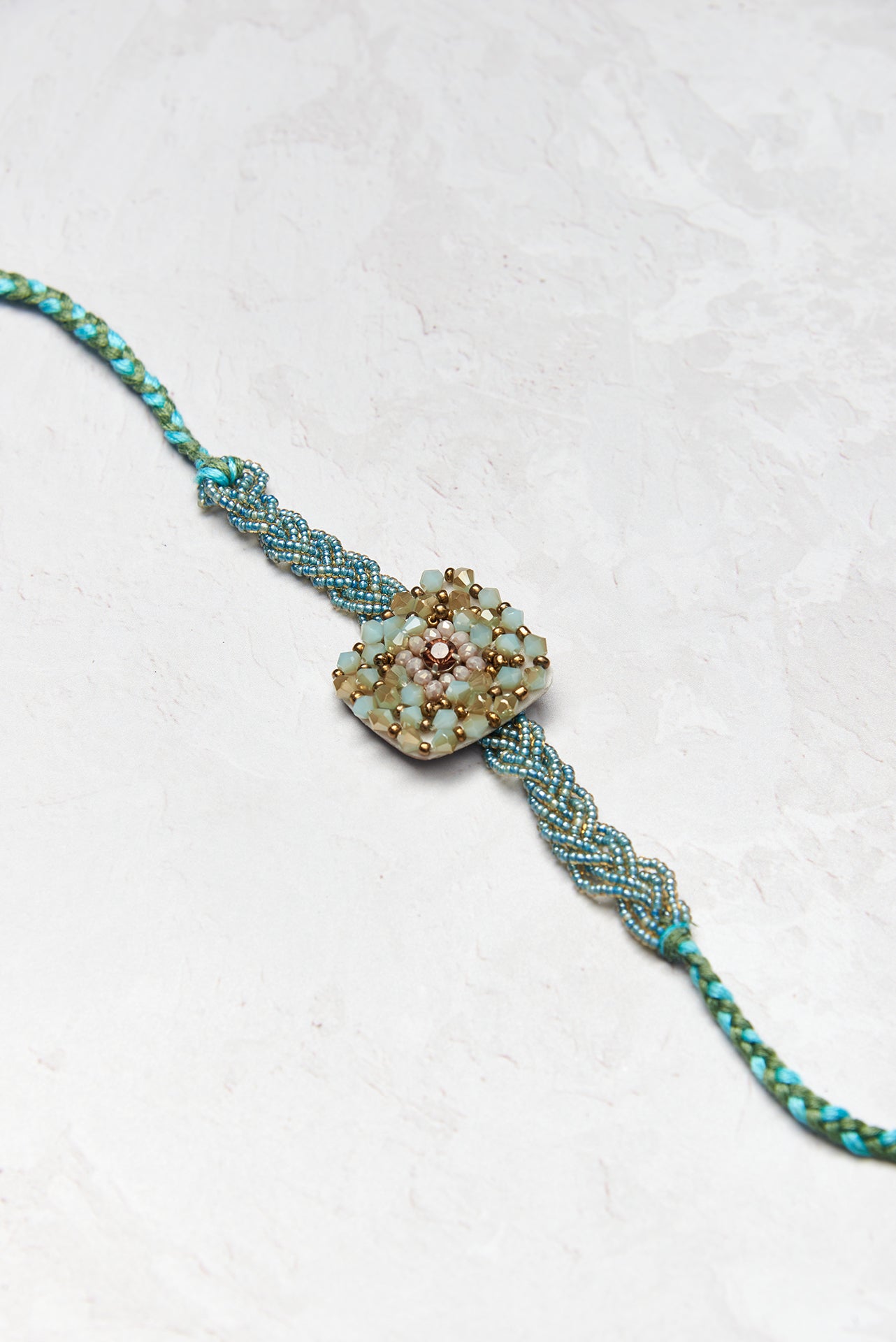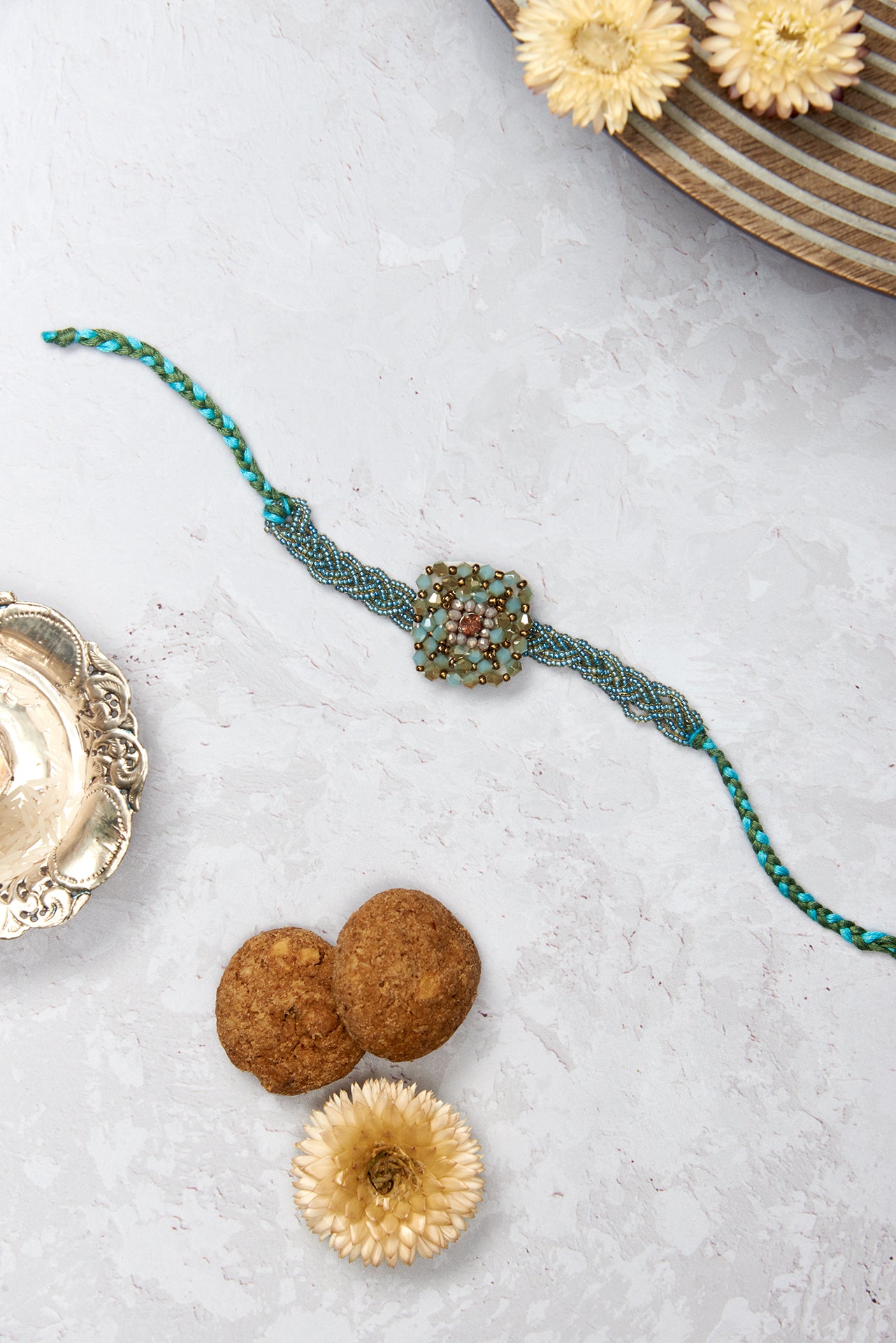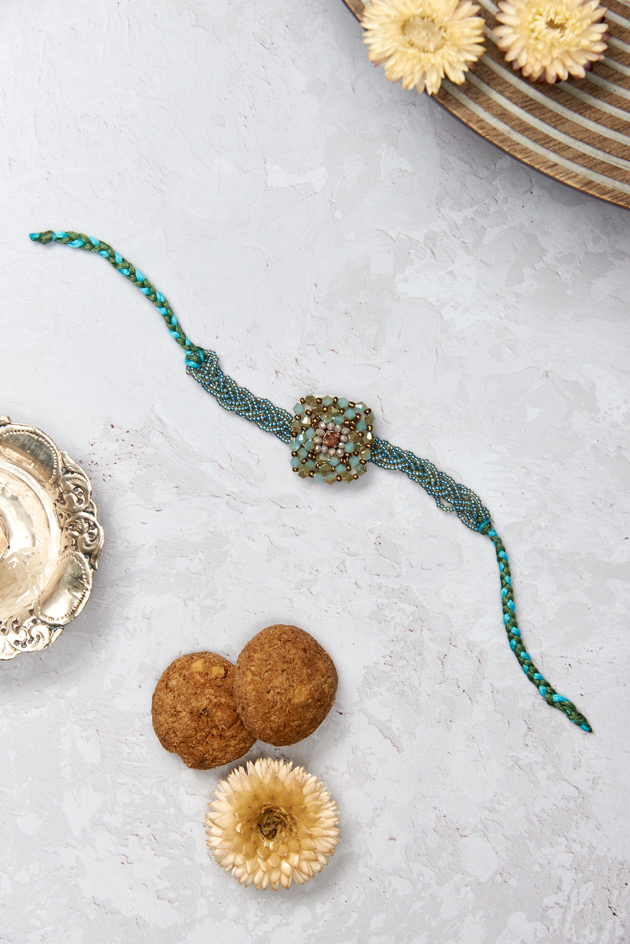 i am a beautiful hand embroidered rakhi with a mini brooch that is detachable. i feature a hand em-broidered beaded band. i am a square shaped rakhi made out of a combination of high quality teal blue and light green stones, along with gold beads. if you’re bro likes blue and is cool like me, he will love me. the back of my mini detachable brooch has an artificial leather finish. it also has a pin that will secure me onto many canvases.