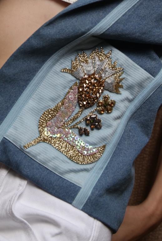 i am a denim sleeveless jacket that celebrates ornamental embroidery. i feature high quality crystal stones, sali beads, kardana beads, holographic sequins, to create exotic embellishments. i have a slim yet relaxed silhouette. i also feature cool hide and seek pockets, and a chic lapel detailing. i am just like my name suggests — exotic and a free explorer on the hunt of wild new discoveries!