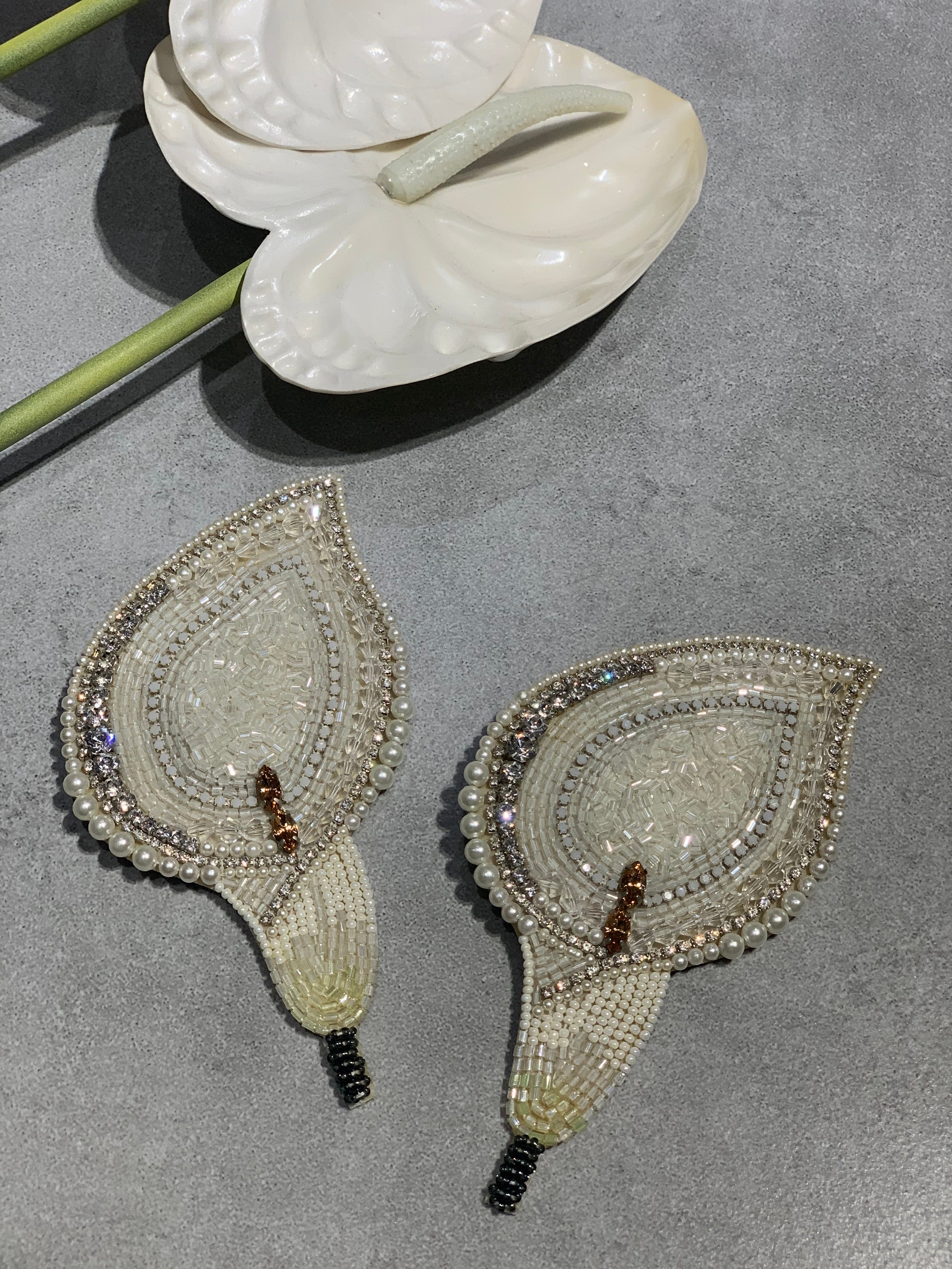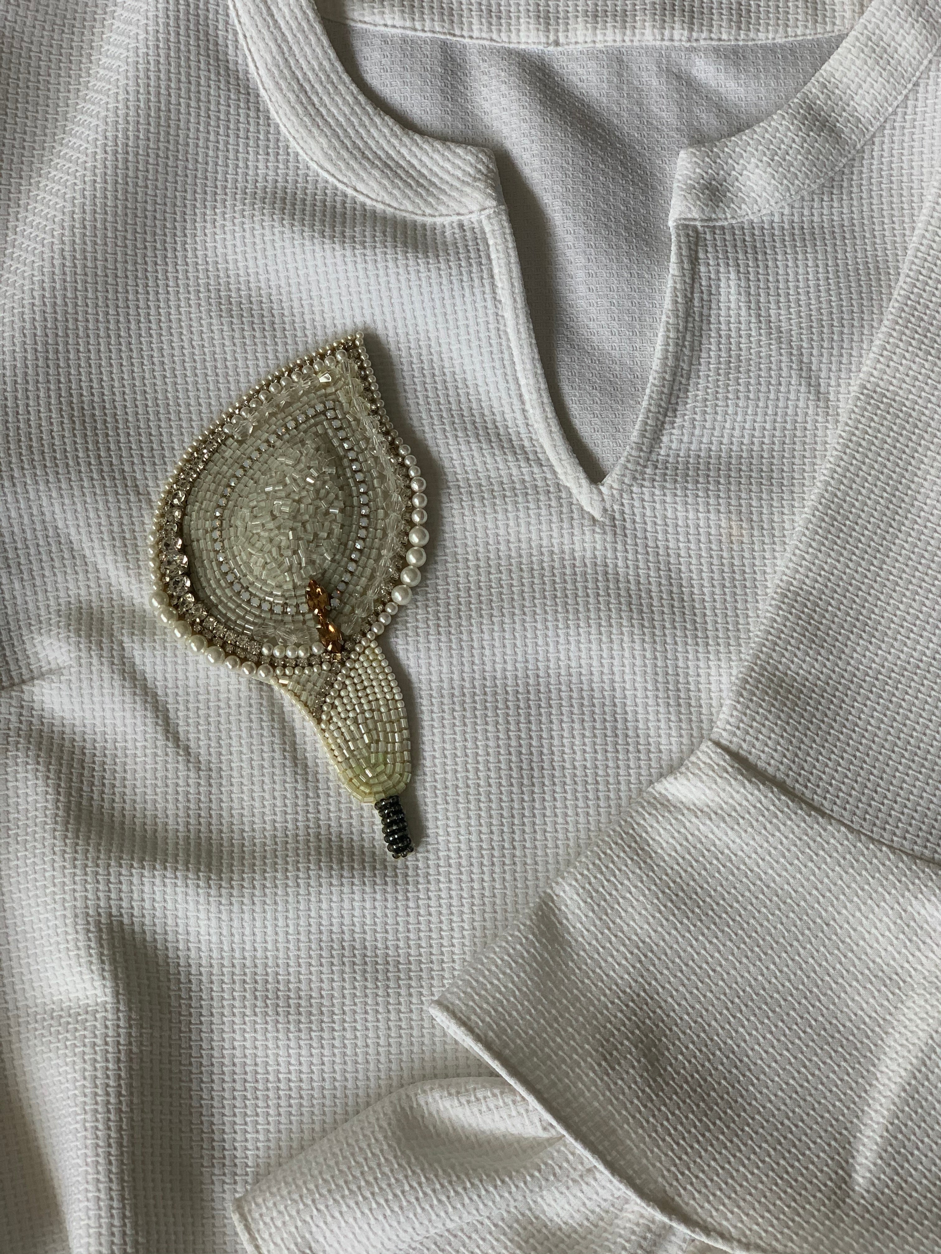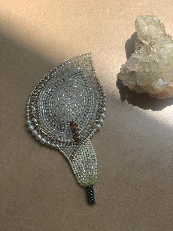 i am a beautiful hand embroidered brooch that looks like a beloved lili. i am larger than your average brooch — i measure approx 3x5 inches. i am intricate in detail featuring high quality ivory pearls, crystal stones and bugle beads. my back has an artificial leather finish. i have a pin that will secure me onto many canvases.
