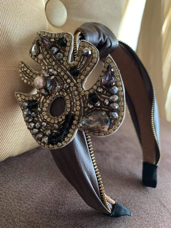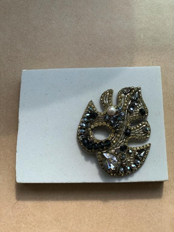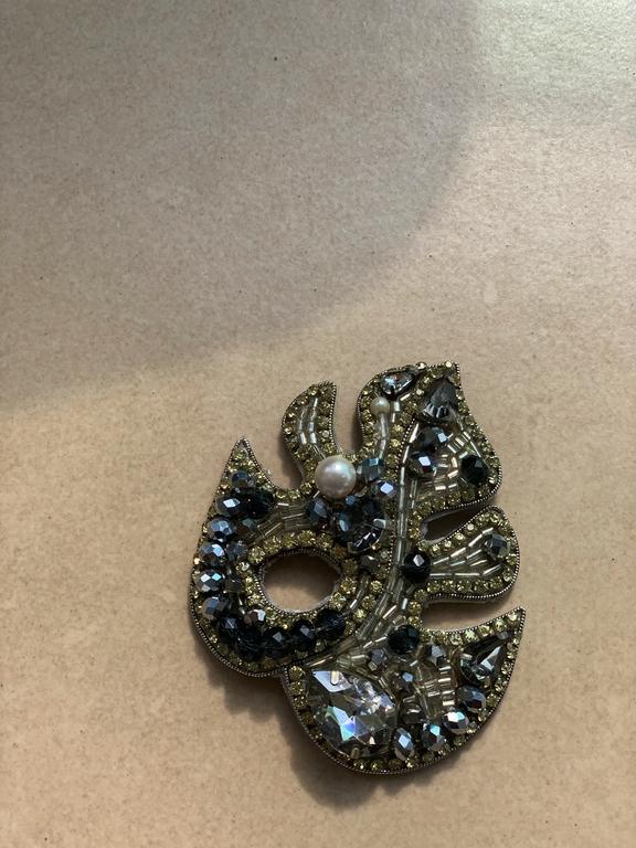 i am a brooch representing nature’s never-ending beauty and the many adventures it promises. i feature edgy cut work hand embroidery. i am larger than you average brooch — i measure 3x3 inches. i am made out of high quality bugle beads, crystals stones, swarovski stones and pearls my back has an artificial leather finish. i have a pin that will secure me onto many canvases