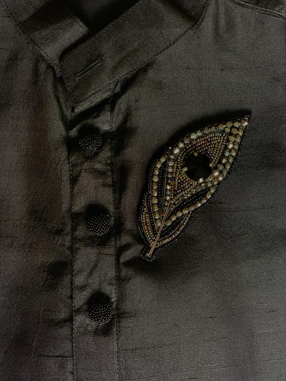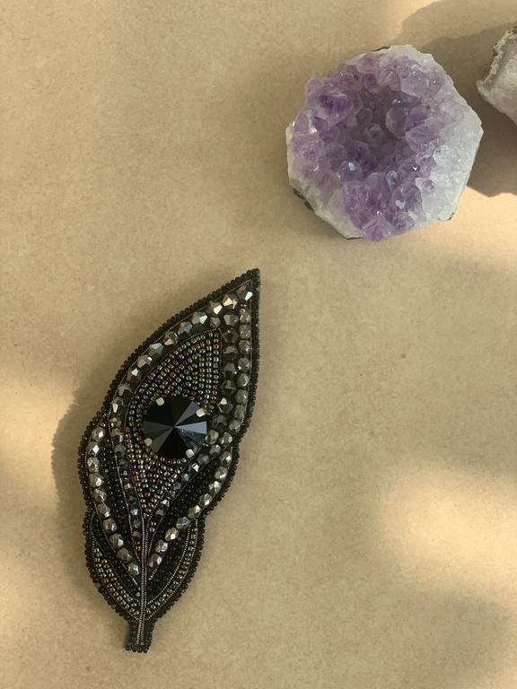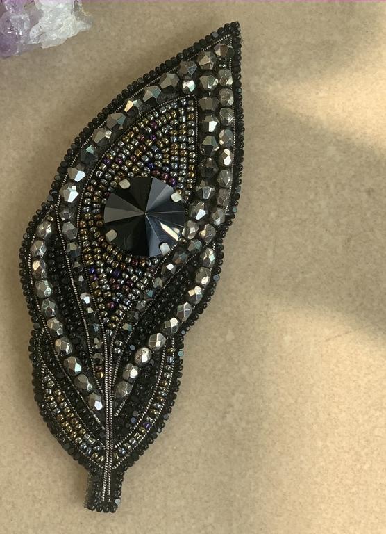 i am a hand embroidered brooch that will never go out of style. i am larger than your average brooch — i measure 2x4 inches. i am made out of high quality black and holographic beads with crystal stones and one centrepiece swarovski stone. my back has an artificial leather finish. i have a pin that will secure me onto many canvases