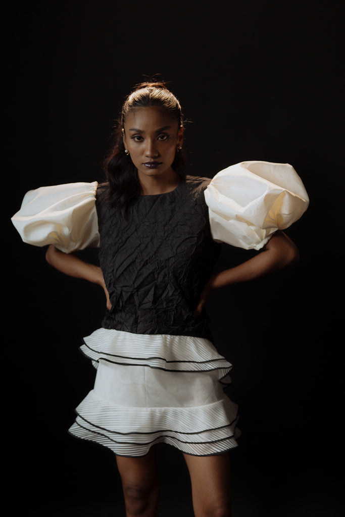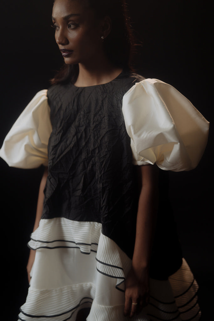 I am what you feel when you think of old secrets shared between two best friends. That fuzzy feeling of nostalgia, love, comfort and memories. I am a piece of style is the forever kind — like an unbreakable bond between two people from absolutely unique backgrounds. I am classic and timeless, and crafted from a beautiful fabric that offers a graceful fall. I am made out of a black crush textured taffeta fabric, cut in a bias flair, enhancing the fluidity of the dress. Adding a touch of charm, two layers of white ruffles crafted from a mesh are delicately attached to my black layer. From the piping to the ruffles, the crush texture to the balloon-y silhouette — every detail of my existence will accentuate your mood the moment you wear me. I am eye catching, cool, easy to wear and have a sense of fun about me.