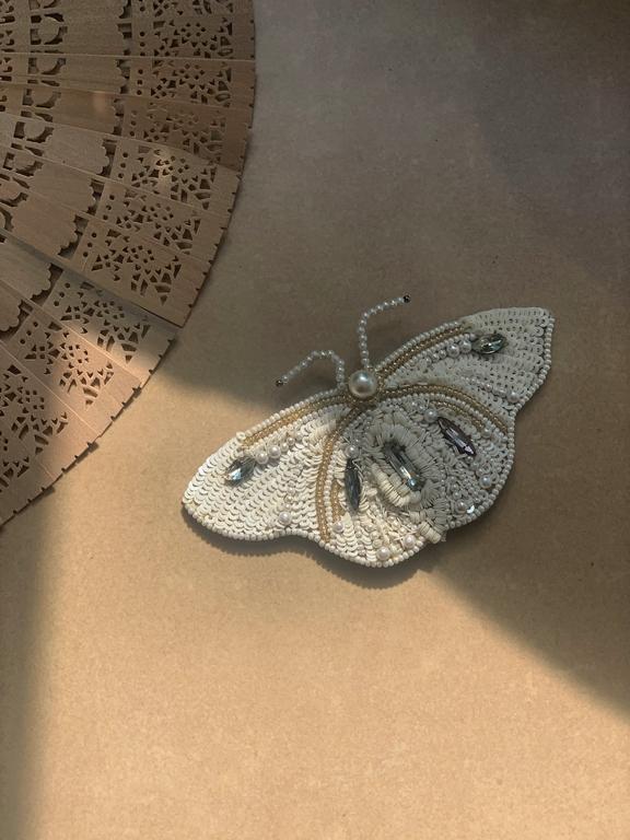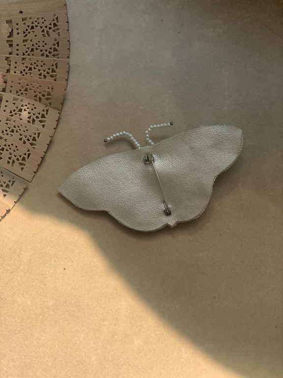 i am a beautiful butterfly-inspired hand embroidered brooch that promises pure joy. i am larger than your average brooch — i measure 4x2 inches. i am intricate in detail and made out of white sequins, crystal stones and pearls. my back has an artificial leather finish. i have a pin that will secure me onto many canvases.