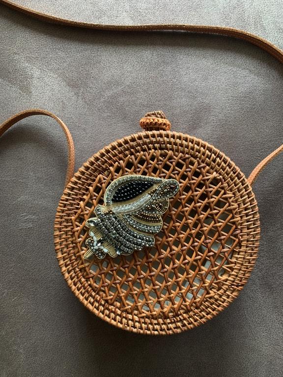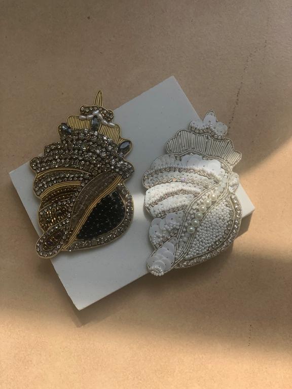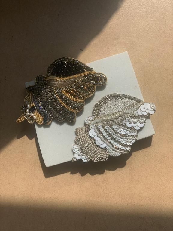 i am a hand embroidered brooch inspired by magnificent sea shells. i am larger than your average brooch — i measure 4x2. 5 inches. i am made out of high quality beads, sequins, crystal stones and wire. my back has an artificial leather finish. i have a pin that will secure me onto many canvases.