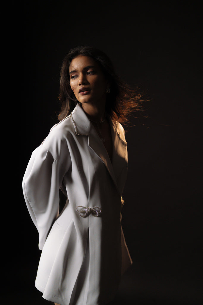I am what you feel when you are on stage, with the spotlight beaming on you, with an audience cheering you on like you are a born star. I am unique, versatile and a style invention of the ages. I offer the grace of a pretty dress with the comfort of skorts — giving you a two-in-one wonder look that is glamorous, elegant and easy to wear day or night. I am crafted from a luxurious and light grey silver stretch fabric which makes me a tactile delight, with a smooth feather like touch that feels like butter on the skin. The dress features two open tucks on the waist that helps accentuate your curves, but offers a flattering silhouette. The fusion of shorts under the dress provided freedom to move, dance and glide across the world like the star you are. The sleeves are the main attraction — with a slight puff blazer sleeve with pin tucks near the armhole — giving that extra oomph to the entire look. To add a touch of glam, I feature two diamond bows on my waist. Complementing this bling are two delicate diamond lines along the collar, elevating my style to a sky-high range.