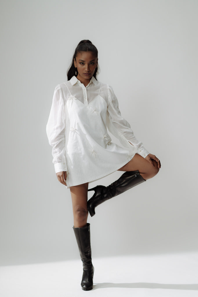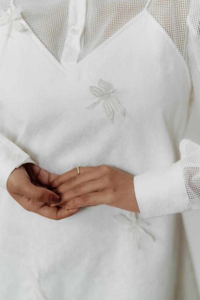 I am what you feel when you enjoy the little simple pleasures of life, like watching pretty white clouds dance in the sky. I am a slip dress that provides a modern twist. Luxe, light and lovely, I am crafted with care, featuring a soft fabric with a slick satin finish. My self-on-self print of delicate petite flowers brings a subtle visual texture play to my personality. The attached mesh shirt provides a chic contrast, with its subtly voluminous sleeves. The classic A-line silhouette makes me a flattering fit for any mood, moment or memory you want to make. But what really adds #thatextraedge to me are the enchanting hand embroidered dragonflies that are scattered across me — depicting the very essence of simple pleasures in life.