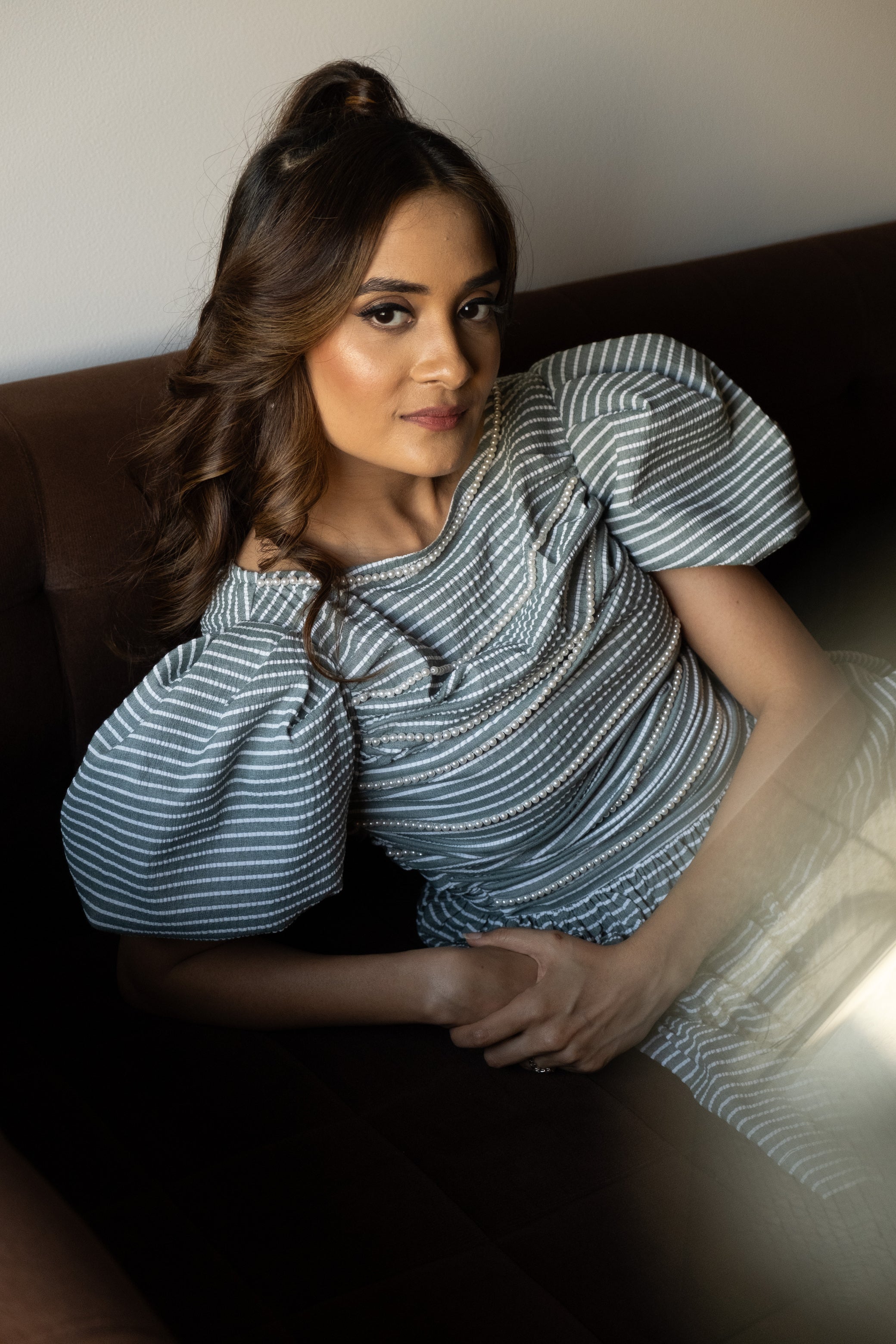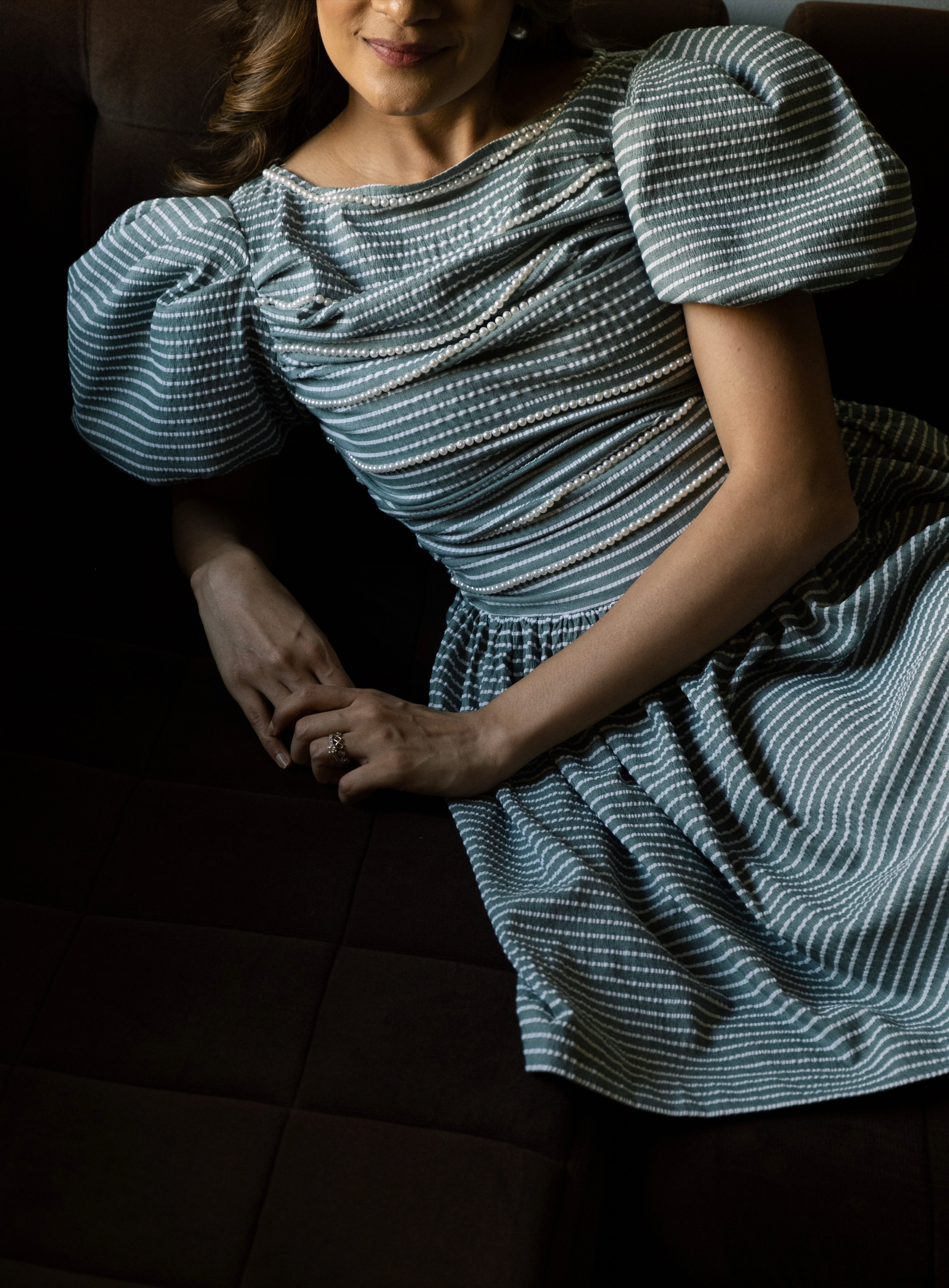 I'm the "Wonderwall Dress," a harmonious blend of classic charm and modern flair. Crafted from green striped seersucker fabric, I offer a flattering fit that hugs your waist before gracefully flaring out, creating a silhouette that's both comfortable and elegant. My bodice features intricate ruching, adding depth and texture while ensuring a snug fit. The thoughtfully arranged stripes form uneven lines, enhanced by delicate pearl accents, offering a unique and slimming visual appeal. My puff sleeves, gathered at the top and finished with an elasticated band, drape gently for an intriguing shape, combining classic and contemporary elements.