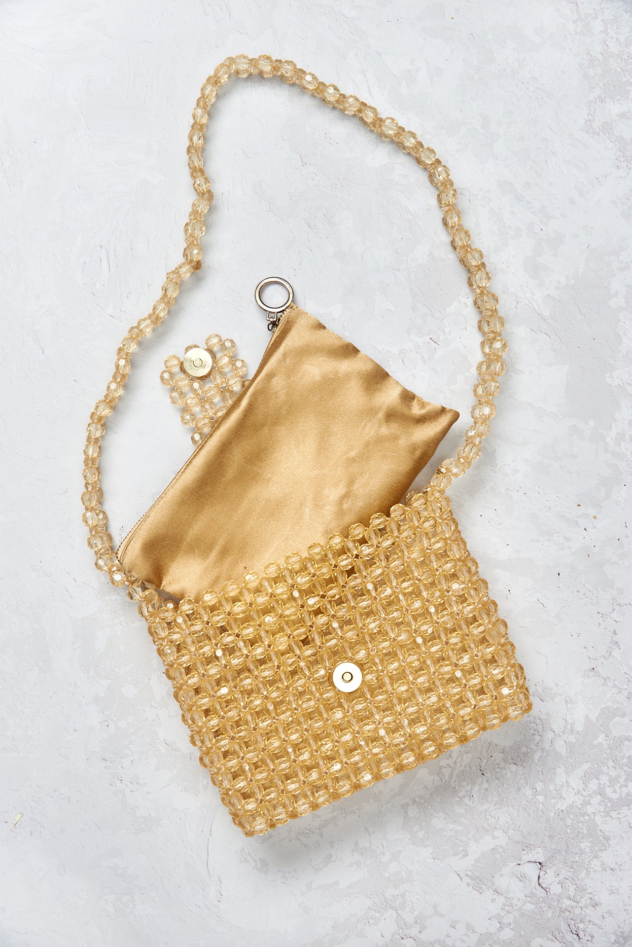 material // designer beads and satin inner pouch