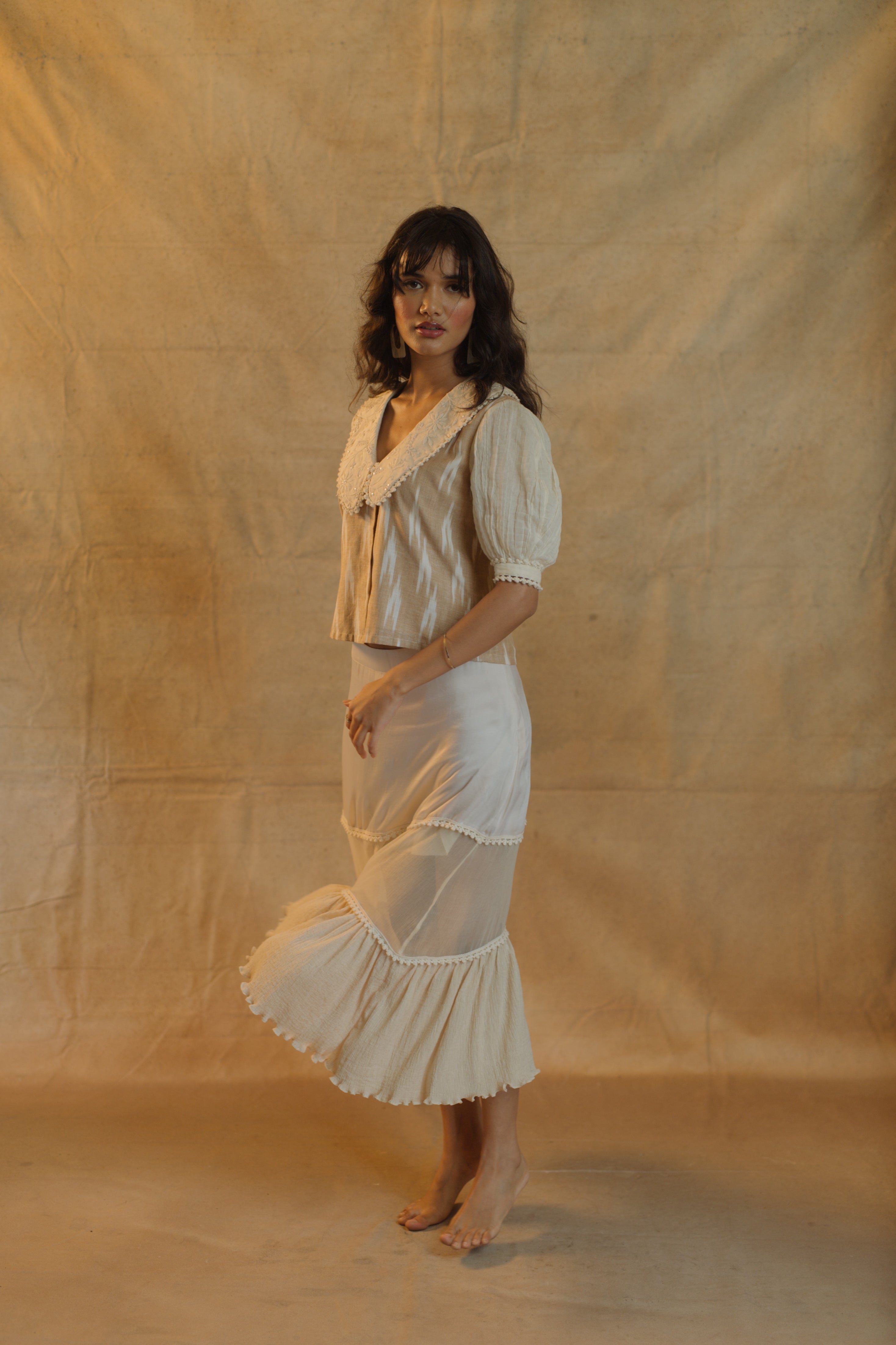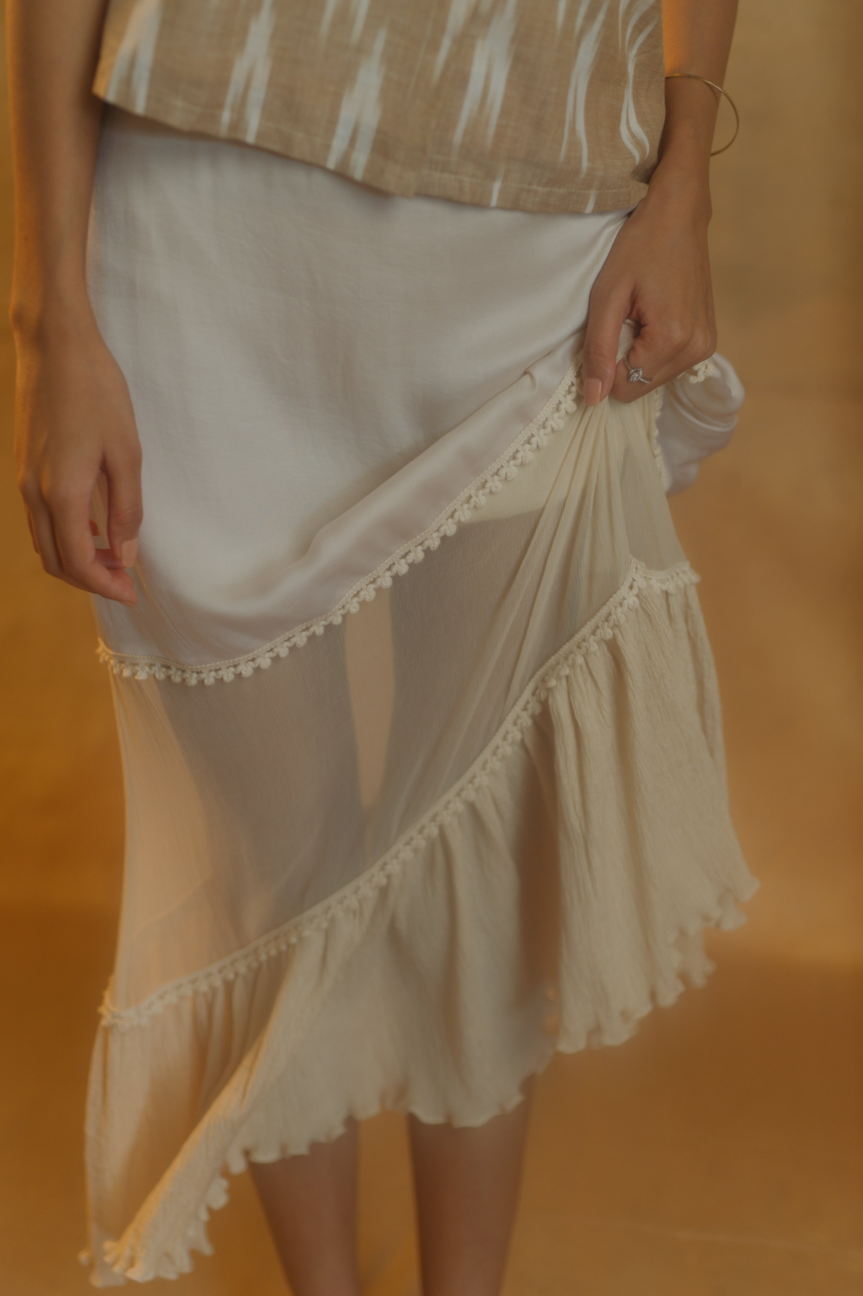 i am a perfect theme for a dream, yes i am. as a skirt i feature a mixture of materials – satin for the shine, chiffon for the sheer and crushed cotton for the style. my silhouette is a midi, free flowing and breathable, and i also feature some lace detailing and a subtle see-through effect on my three-tiers. all the details and elements give me a very vintage glam chic look. and when it comes to midi skirts, it was IN then, it is IN now, and it will be forever IN.