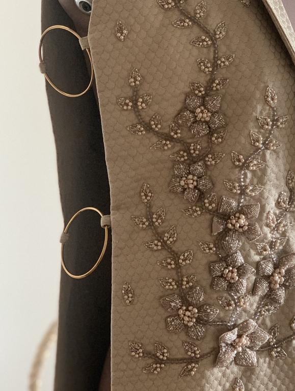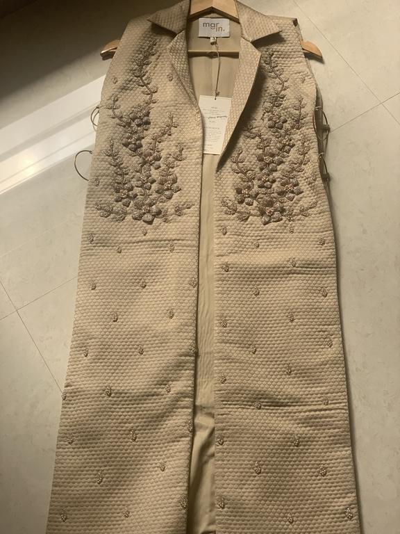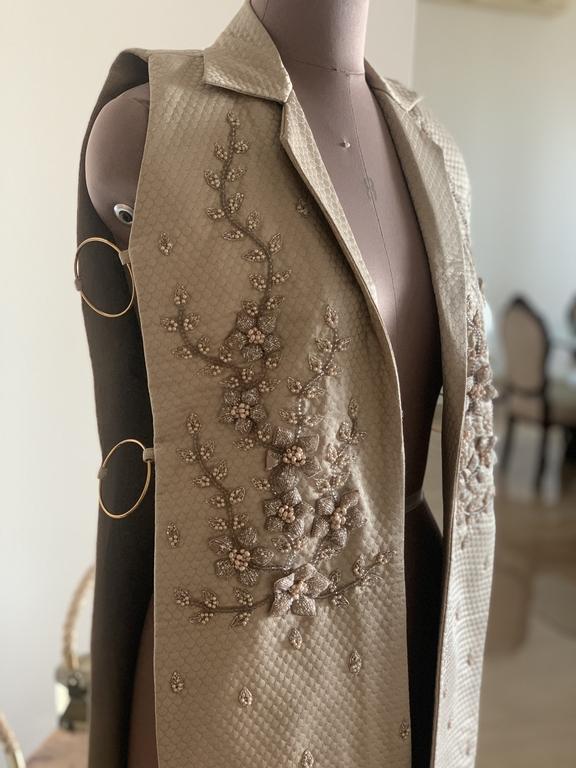 i am a signature bangle jacket in a gorgeous champagne hue. i feature three-dimensional floral hand embroidery made out of high quality bugle beads and pearls. my silhouette is an easy breezy dream. i am also available in a different version: an edgy sleeveless blazer jacket with angular pockets. i will get you a lot of attention, everywhere.
