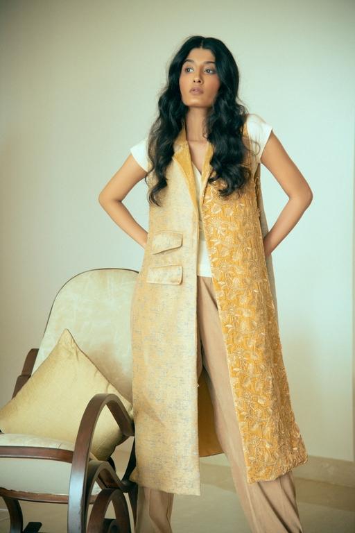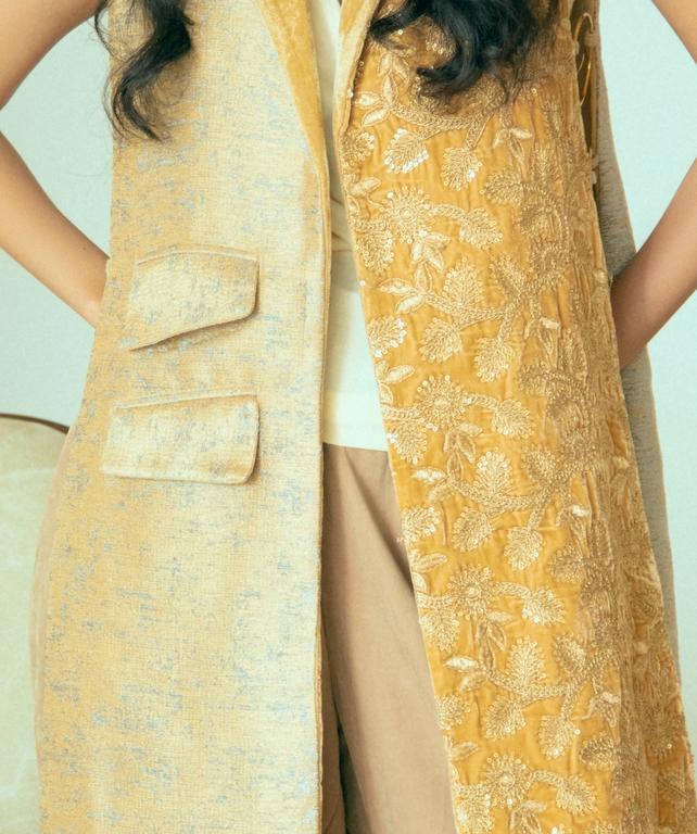 i am a signature style in this story. i am an open bangle jacket with a freestyle silhouette. i give off indo-western feels. i am intriguing thanks to my dual-sided avatar. one side of my front features an embroidered velvet fabric. while the other side and the back is crafted out of textured fabric. i am super popular.