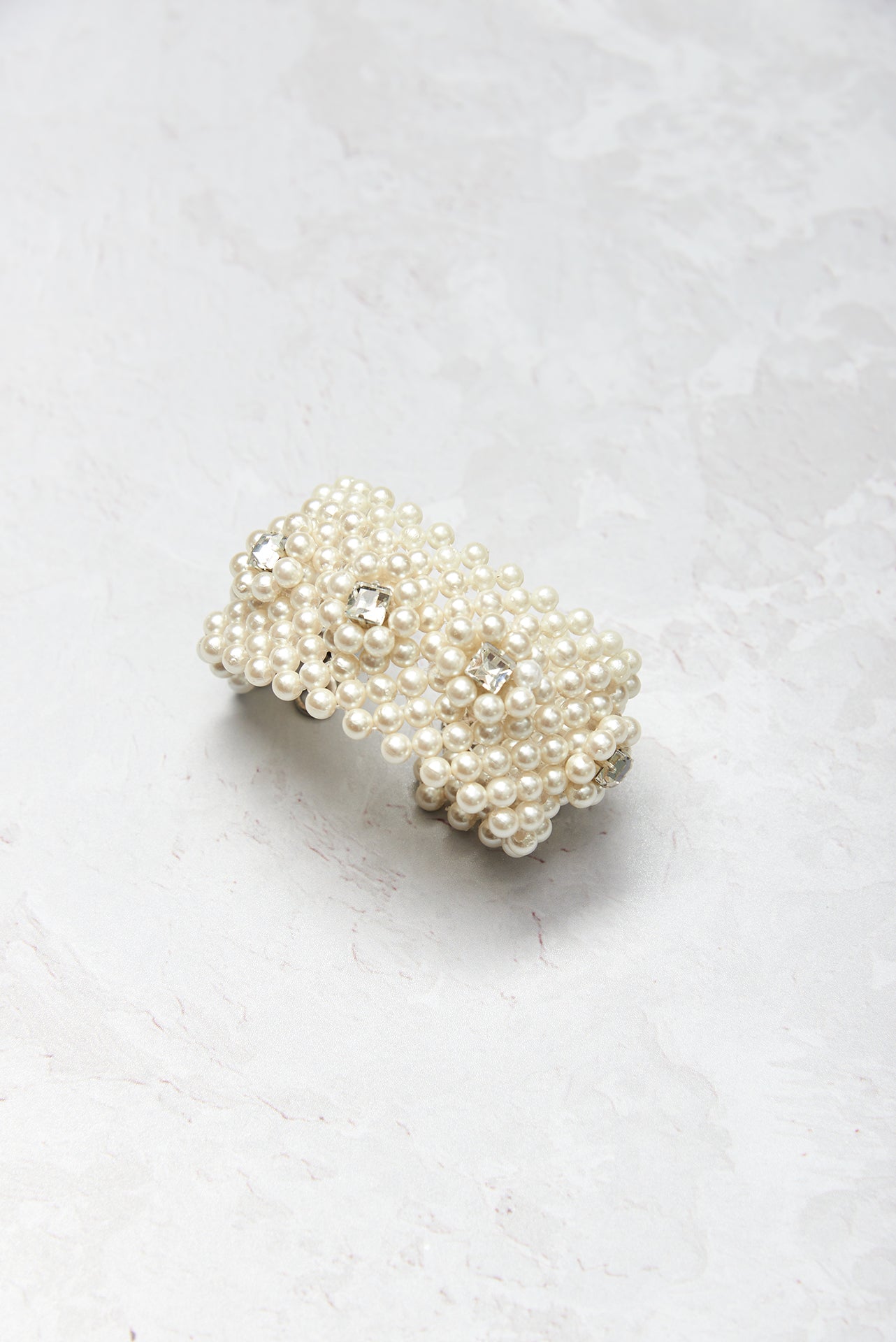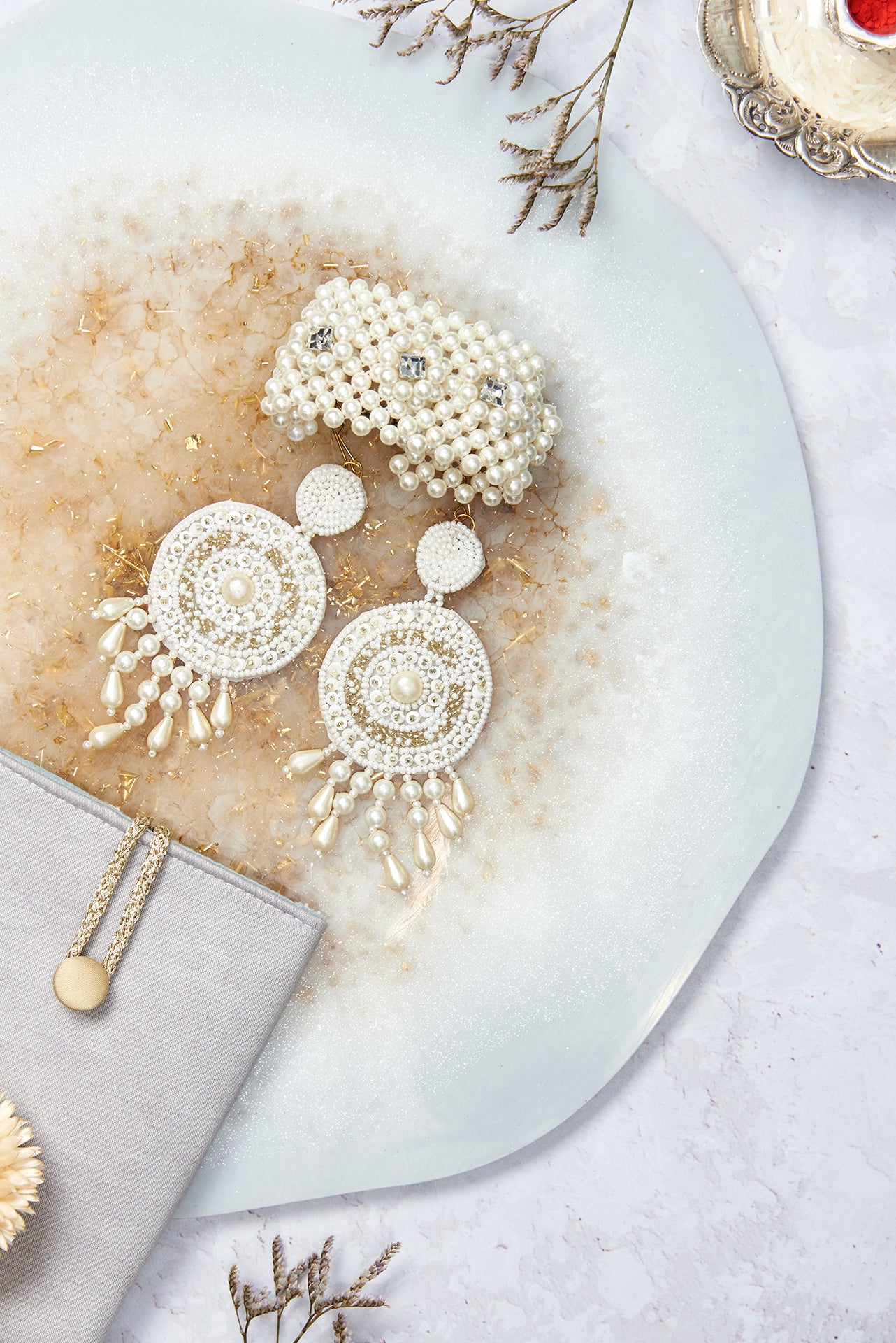 i am a beautiful hand embroidered lumba especially crafted for bhabhis and sister in laws this raksha bandhan. i feature a bracelet with hand embroidered hangings that can be worn as earrings. i am a true classic, made of ivory and pearl beads! i am super elegant too! i am a great way to tell your bhabhi she’s the best!