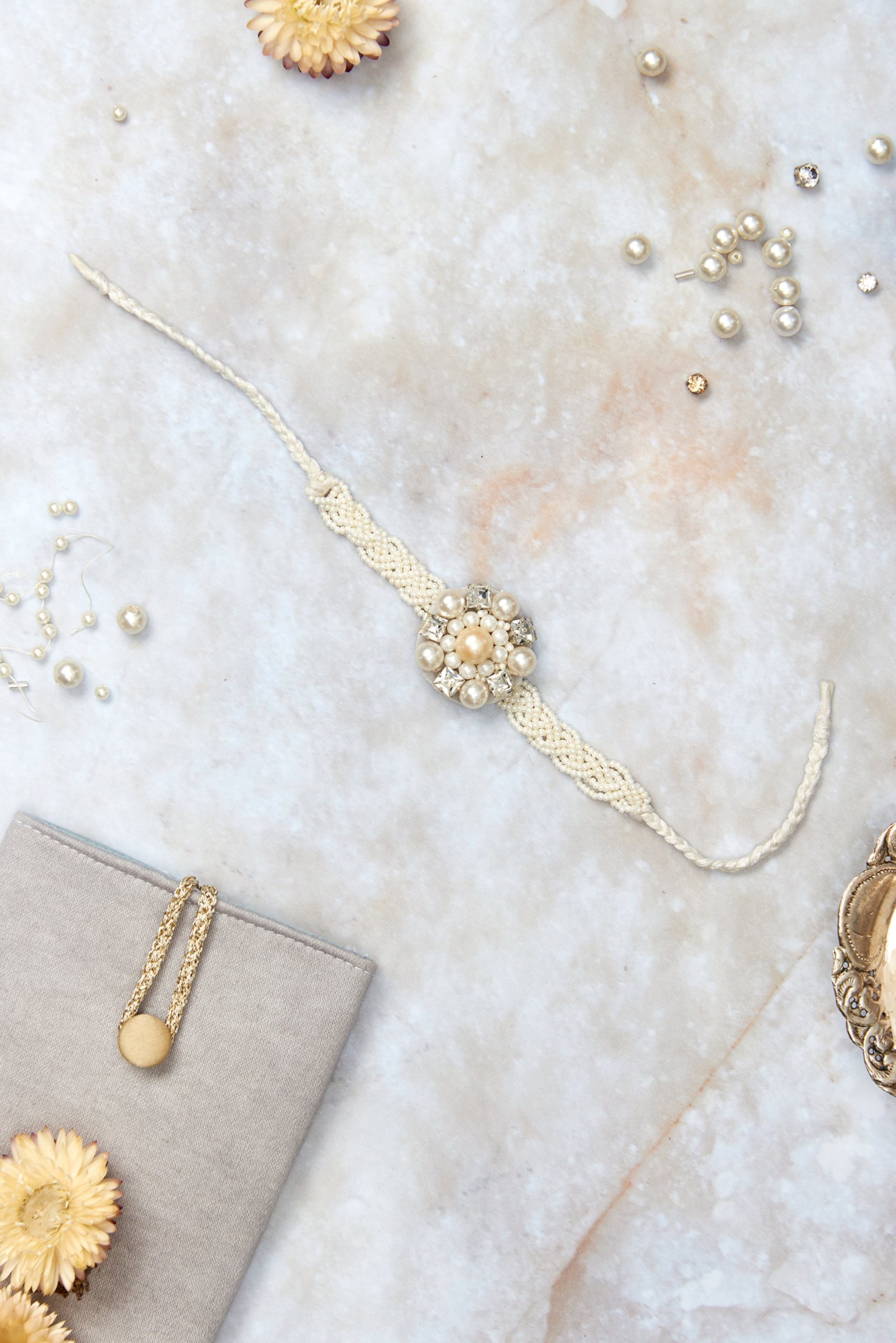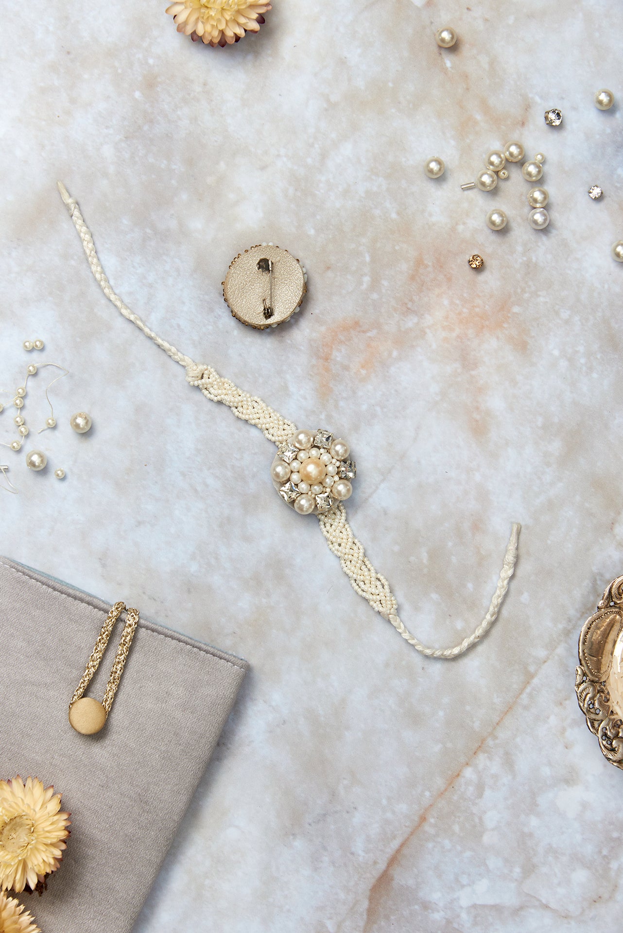 i am a beautiful hand embroidered rakhi with a mini brooch that is detachable. i feature a hand embroidered beaded band. i love pearls and my design is made up of a cluster of them along with high quality crystal stones. i am for the bro who loves all things classic. the back of my mini detachable brooch has an artificial leather finish. it also has a pin that will secure me onto many canvases.