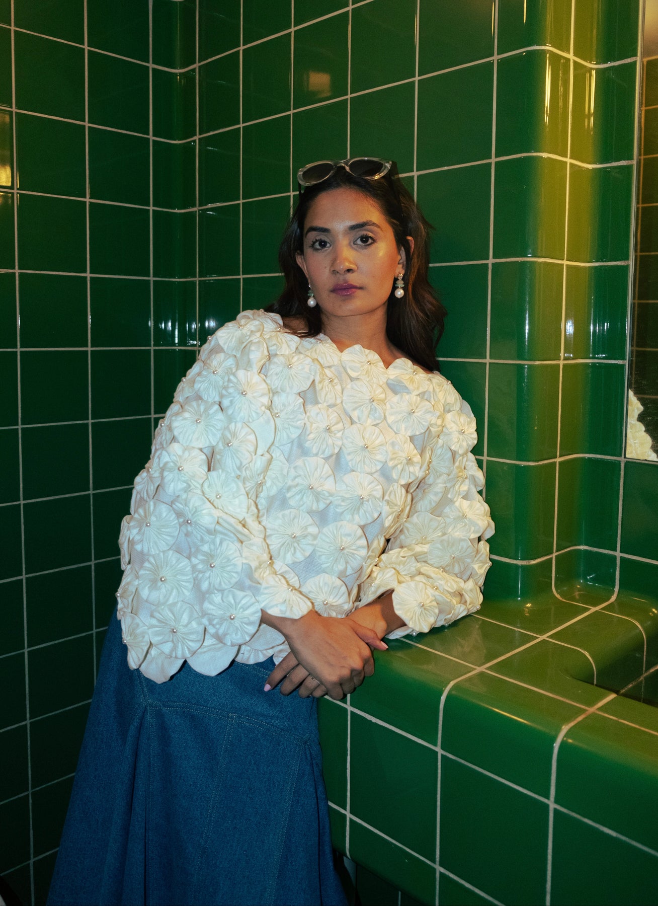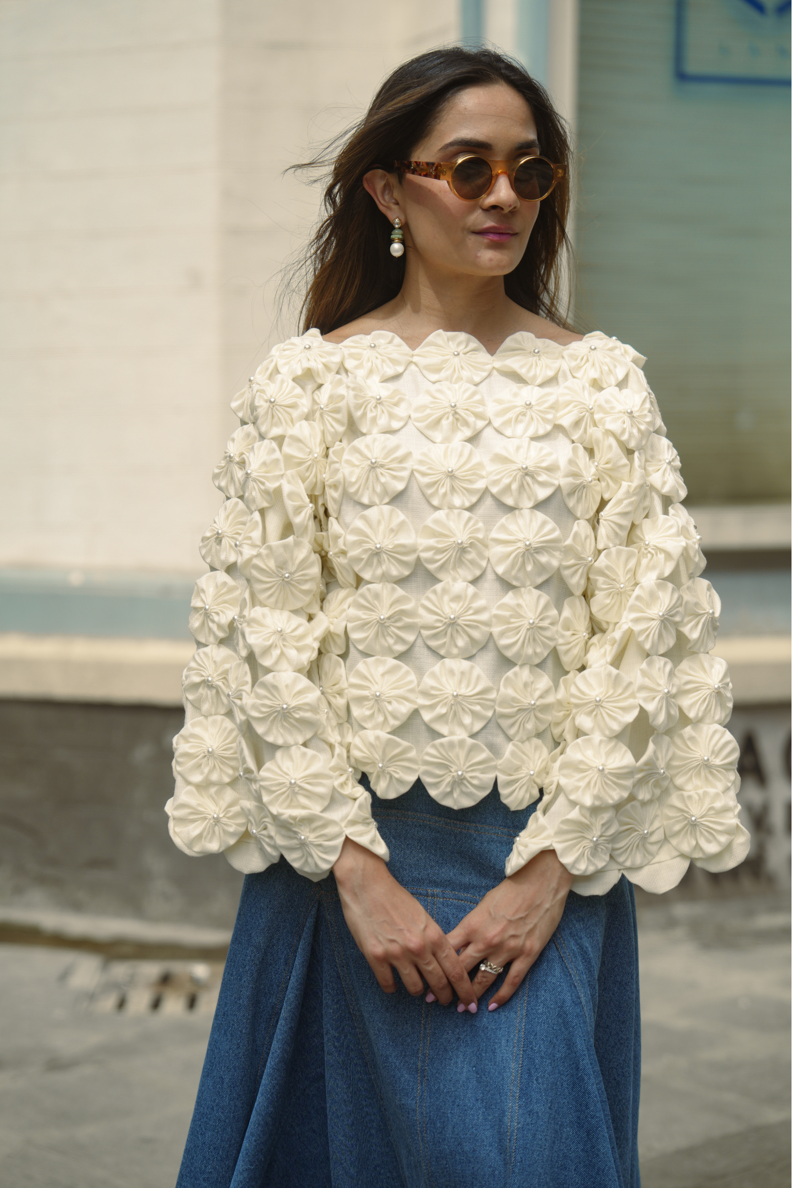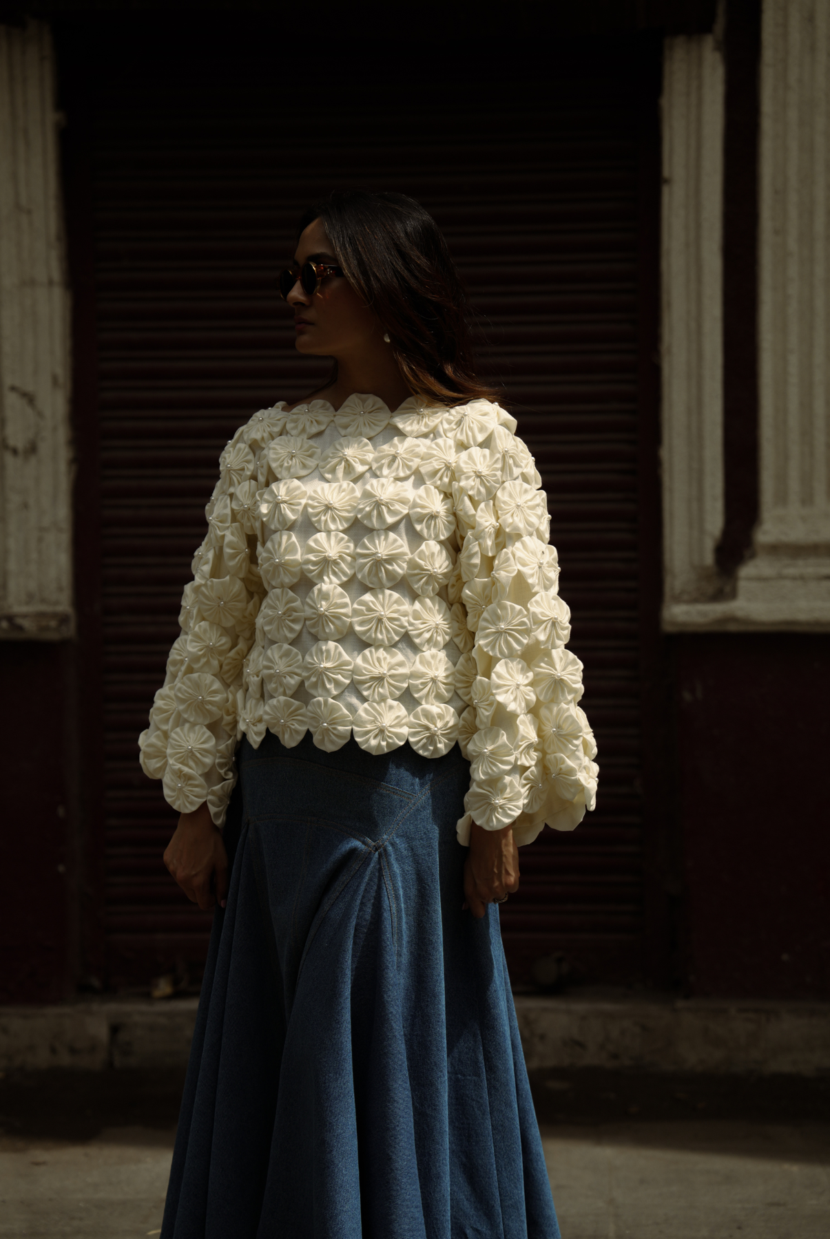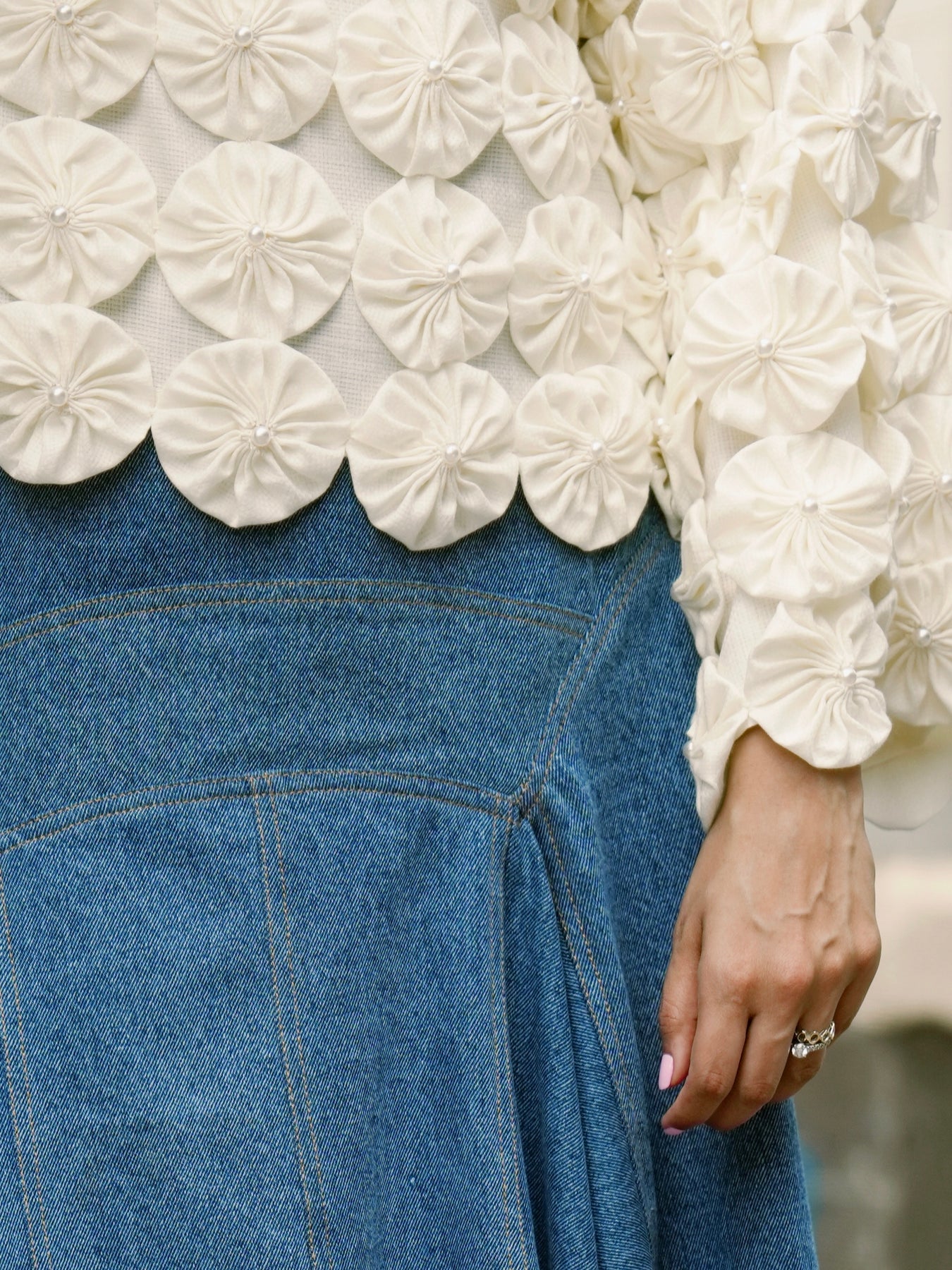 I’m the Bloom Hour Set, reimagined — this time with denim in the spotlight. My kimono-style top brings softness with structure: off-white, gently flared sleeves, and hand-stitched florals made from scraps — each one a little thread of intention. Think bloom, not bling. Contrast, not chaos.