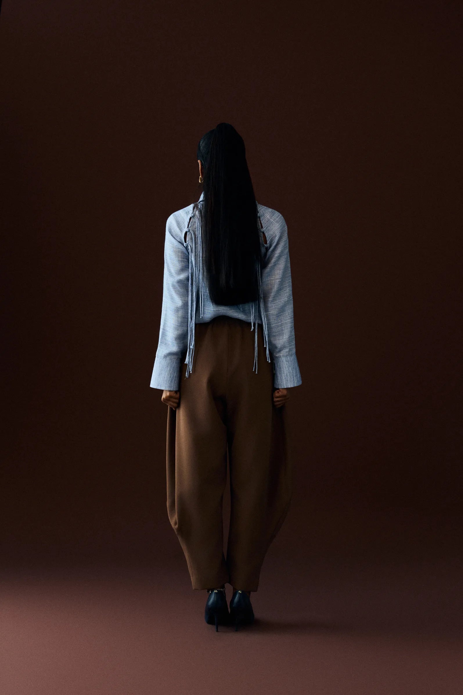 Why settle for one version of yourself? I’m the Detach Yourself Top—a blue linen shirt designed to shape-shift with you. My detachable sleeves let you go from sharp to undone in seconds, while my tailored cut keeps structure intact even when you loosen things up. Look closely and you’ll find “what if…” stitched on my cuff—a small reminder that style’s best when it leaves room for change.