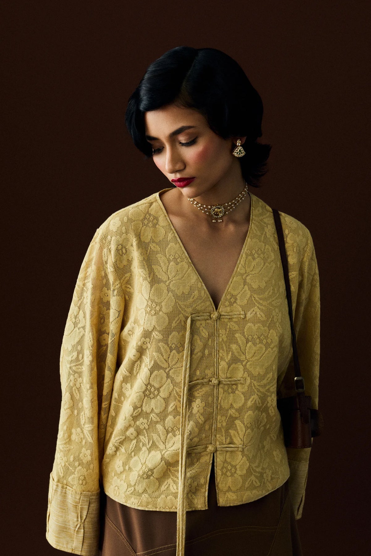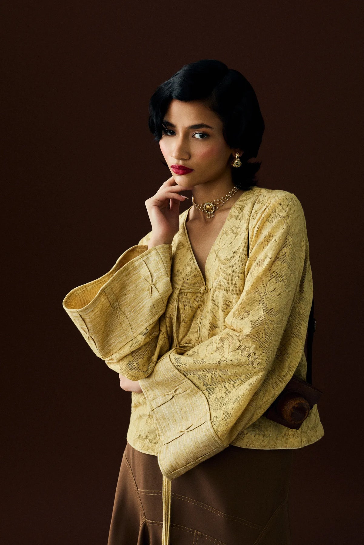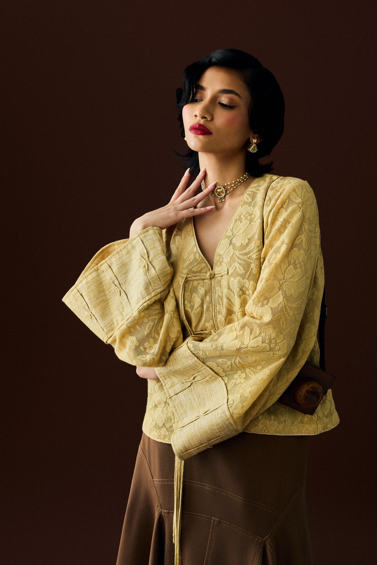 Some sleeves deserve the spotlight. I’m the In-Zen Top—a Japanese-inspired yellow lace blouse designed with dramatic bell sleeves that steal just the right amount of attention. My linen-textured cuffs add structure to my otherwise airy shape, and my mix of classic lines with contemporary detail makes me as cultured as I am chic. I’m the piece you reach for when you want something subtle yet unmistakably different.
