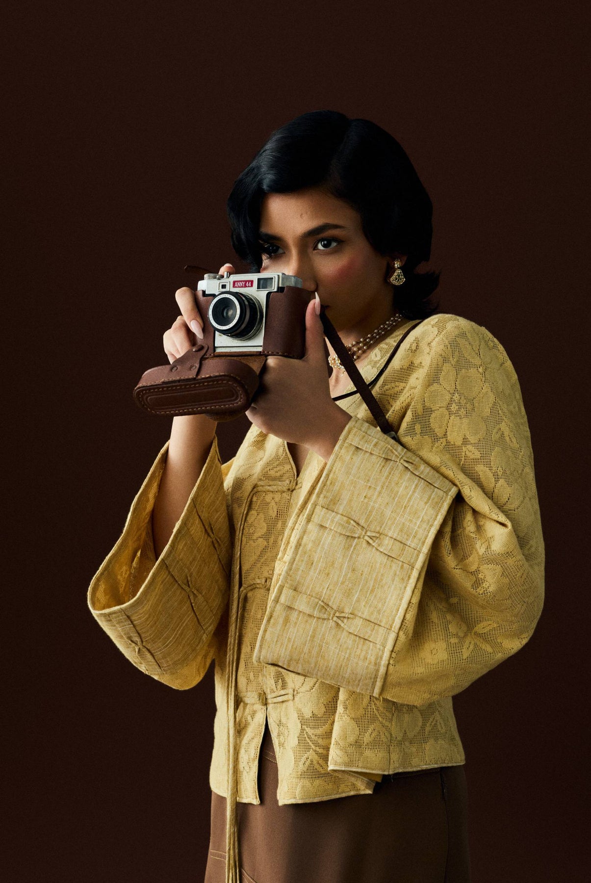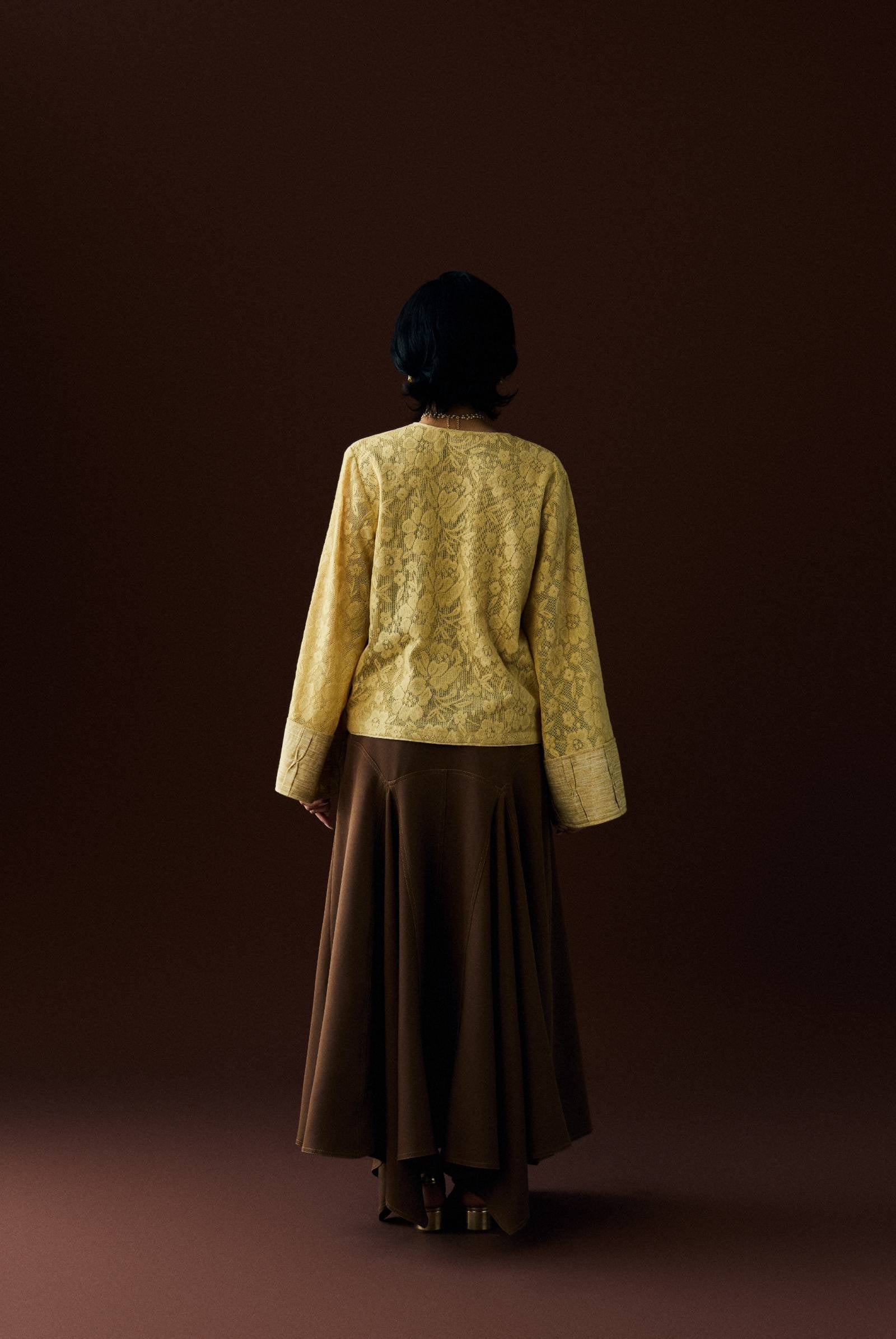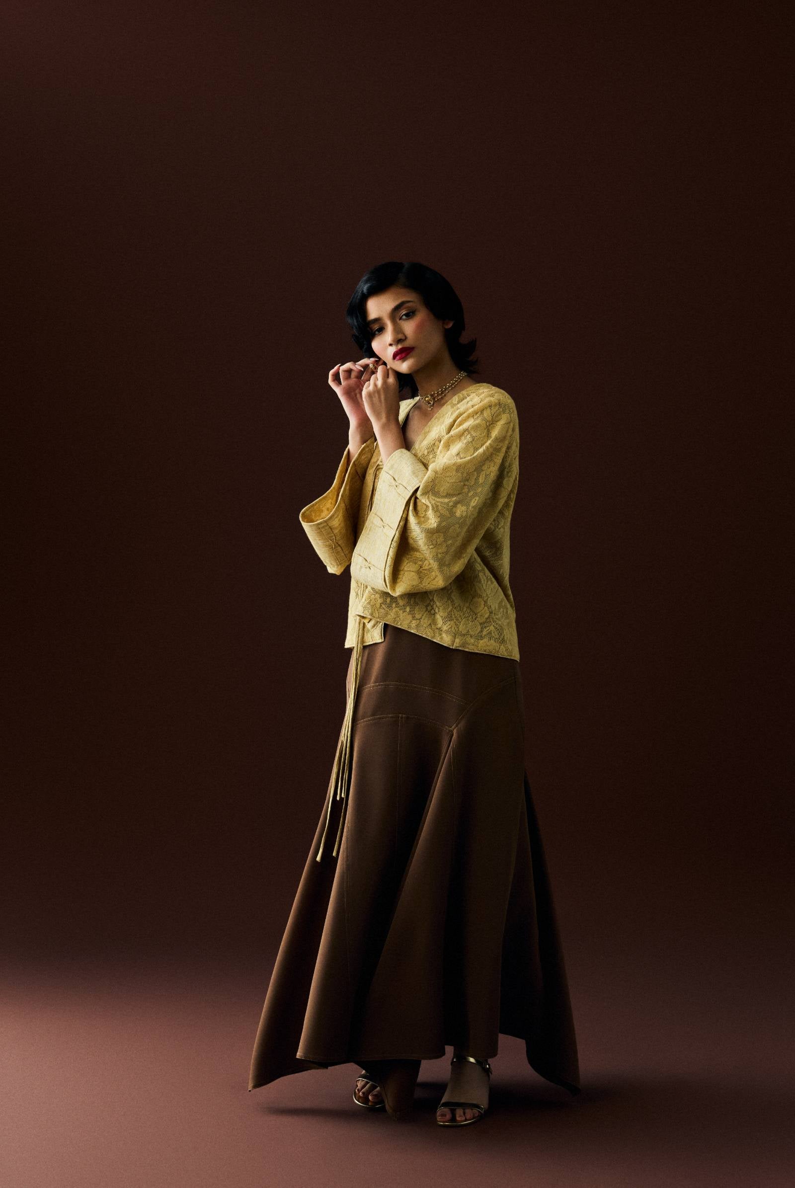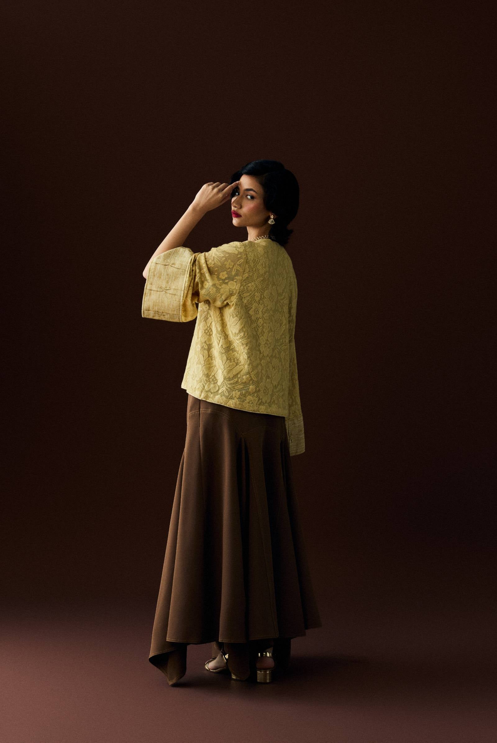 Some sleeves deserve the spotlight. I’m the In-Zen Top—a Japanese-inspired yellow lace blouse designed with dramatic bell sleeves that steal just the right amount of attention. My linen-textured cuffs add structure to my otherwise airy shape, and my mix of classic lines with contemporary detail makes me as cultured as I am chic. I’m the piece you reach for when you want something subtle yet unmistakably different.