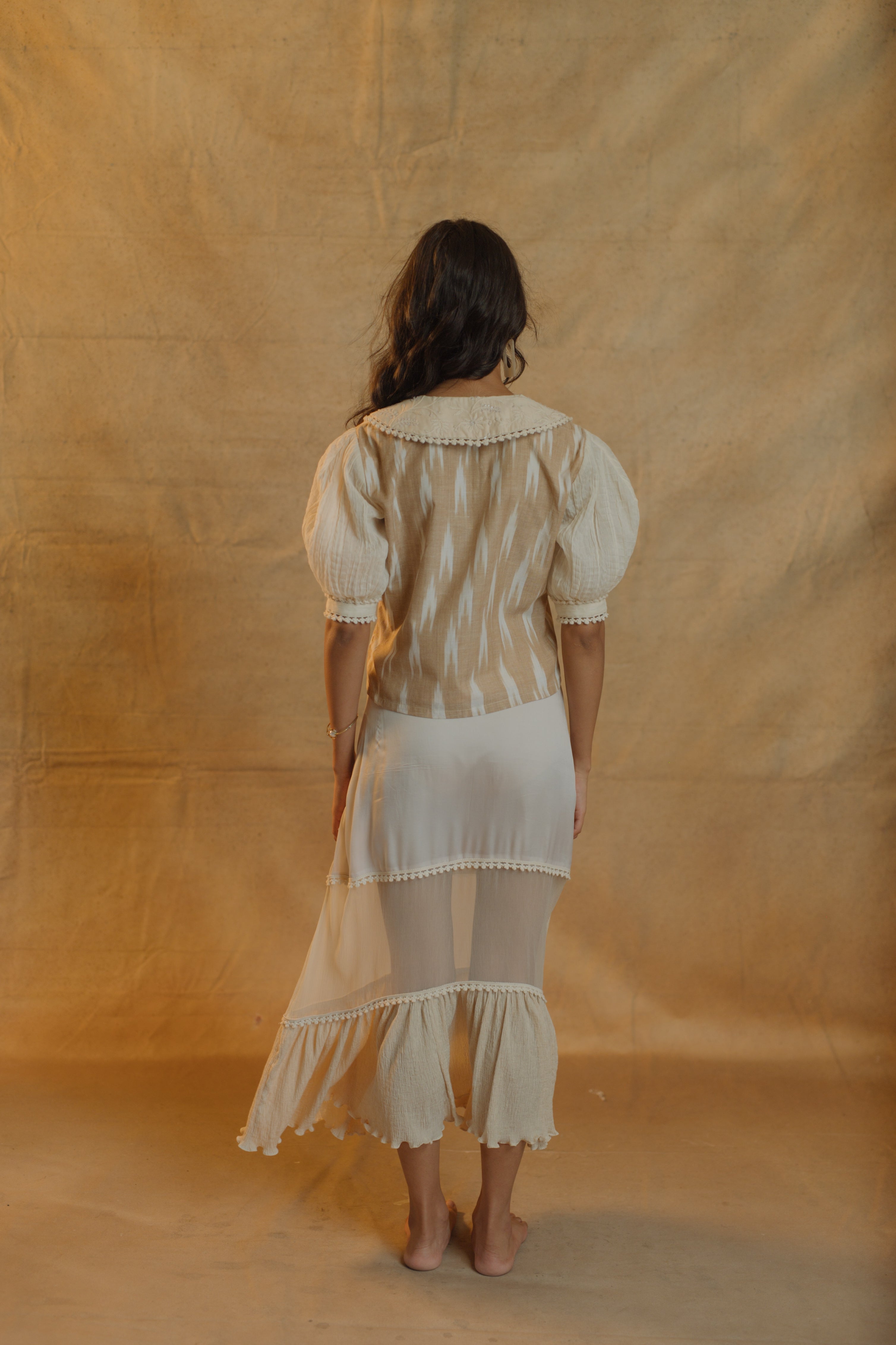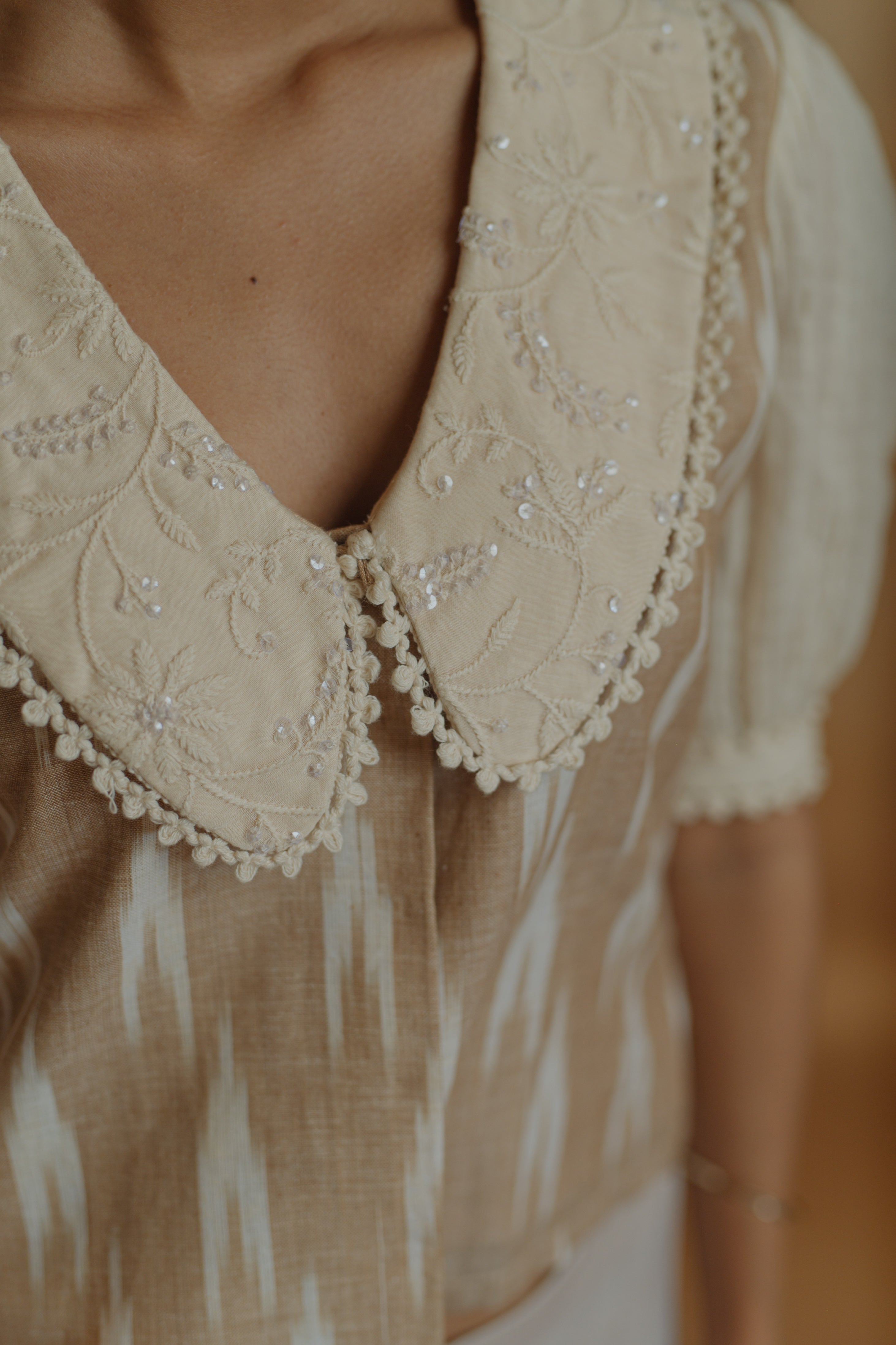i am a perfect theme for a dream, yes i am. as a short blouse i am a unique mixture of materials like ikat cotton and mal. the blouse features a round chelsea collar which showcases beautiful thread embroidery with sequinned highlights. there is lace detailing to give it a dreamy feel and puff sleeves for a retro vibe. the use of ikat adds an indo touch to this pretty ensemble. the chelsea collar comes from the sixties and seventies and really lends to the vintage glam look that i am going for. you can pair me with a short skirt, with denim bottoms, or get me as a set, the way i was intended to be.