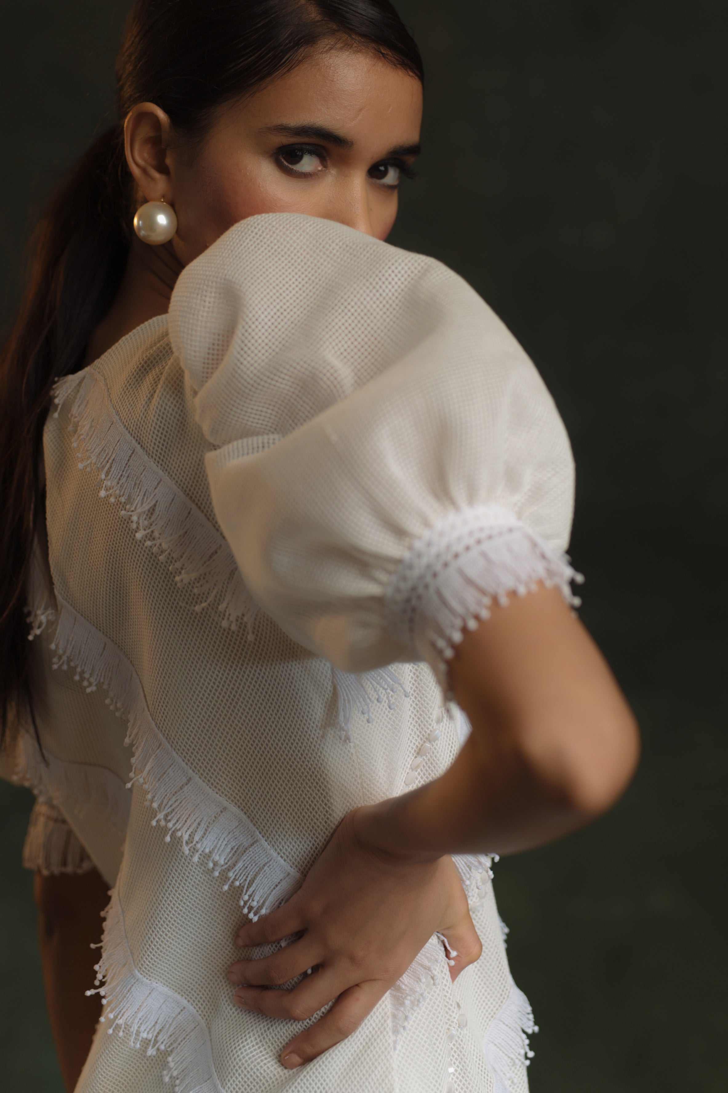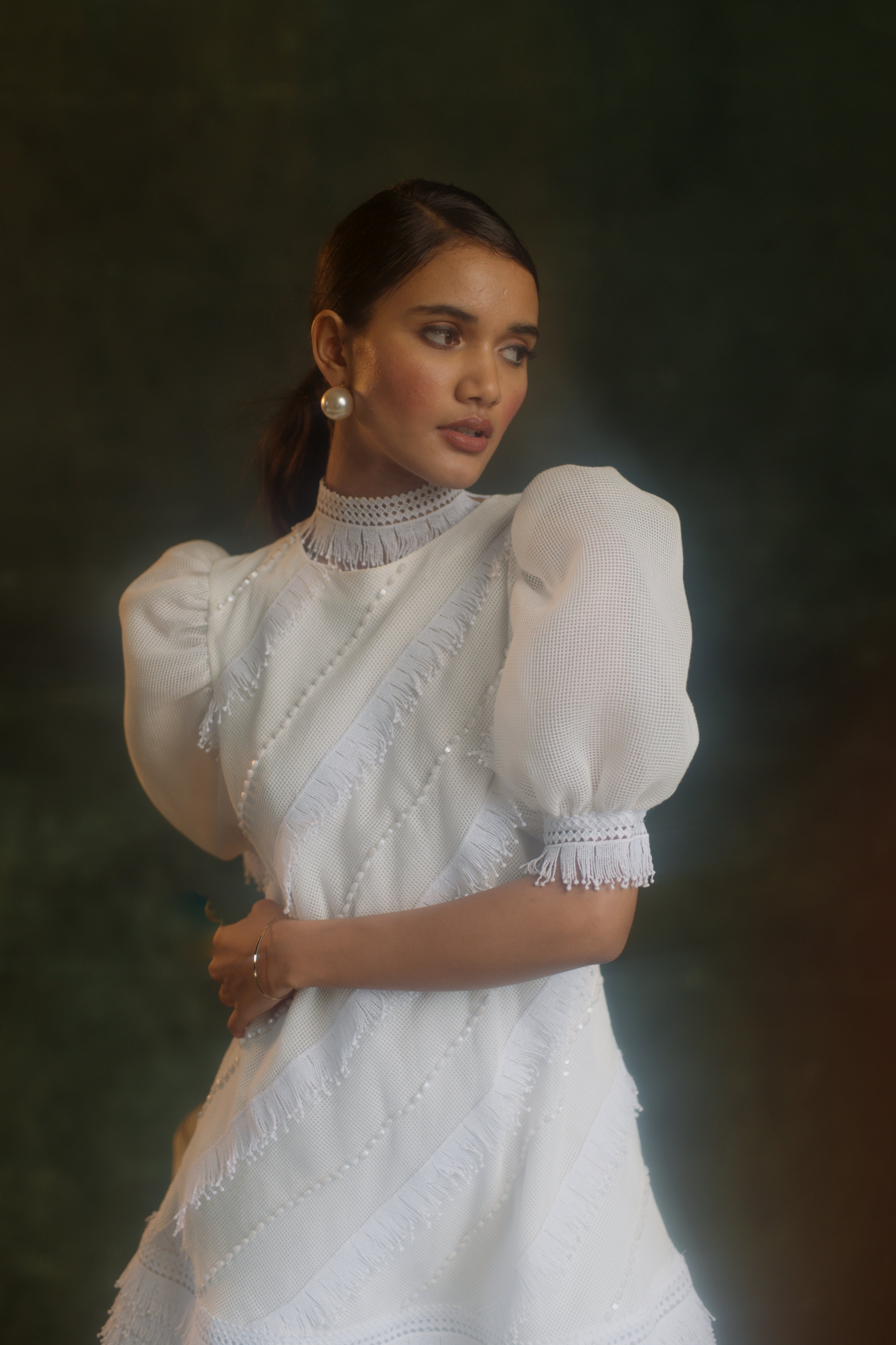 i am a carefully executed work of memory, art and lots of heart. reminiscent of pretty white dresses you’d wear as little girls, with dramatic poofy sleeves and lots of lace, this beauty has come to life, as we pressed rewind and remembered our greatest and most stylish times. i am crafted from a luxe cotton mesh fabric and have an a-line silhouette with a round neck and pretty puff sleeves. i am designed as a little white dress and feature diagonally placed fringe lace all over with layers of fringe lace on the bottom to give that WOW factor. to make me even prettier, you will find hand embroidered pearls scattered all over too. for easy wearability and comfort, i have a back loop button and a side zip. i am totally one of a kind and promise to give you #thatextraedge, always and forever xoxo.
