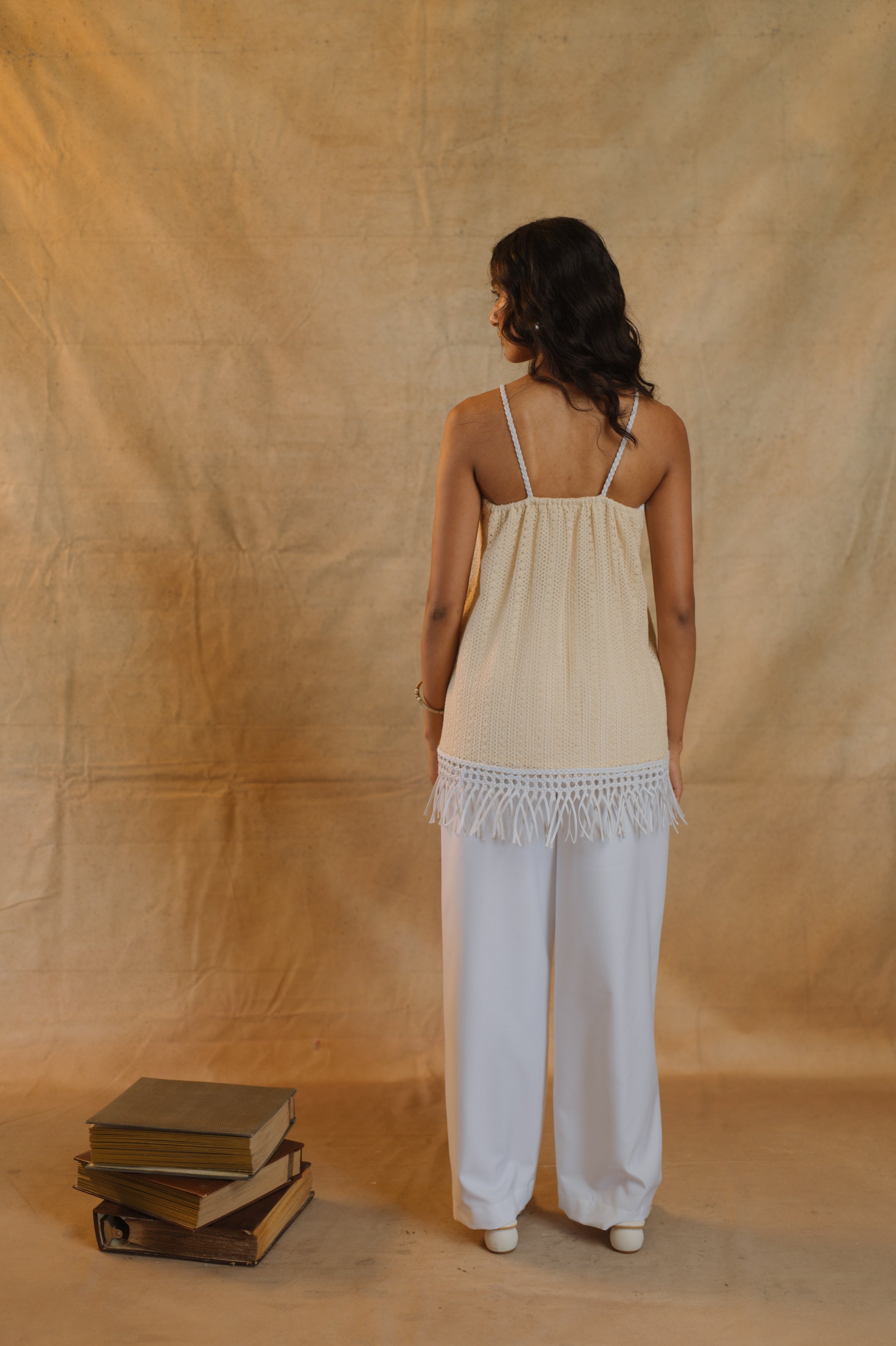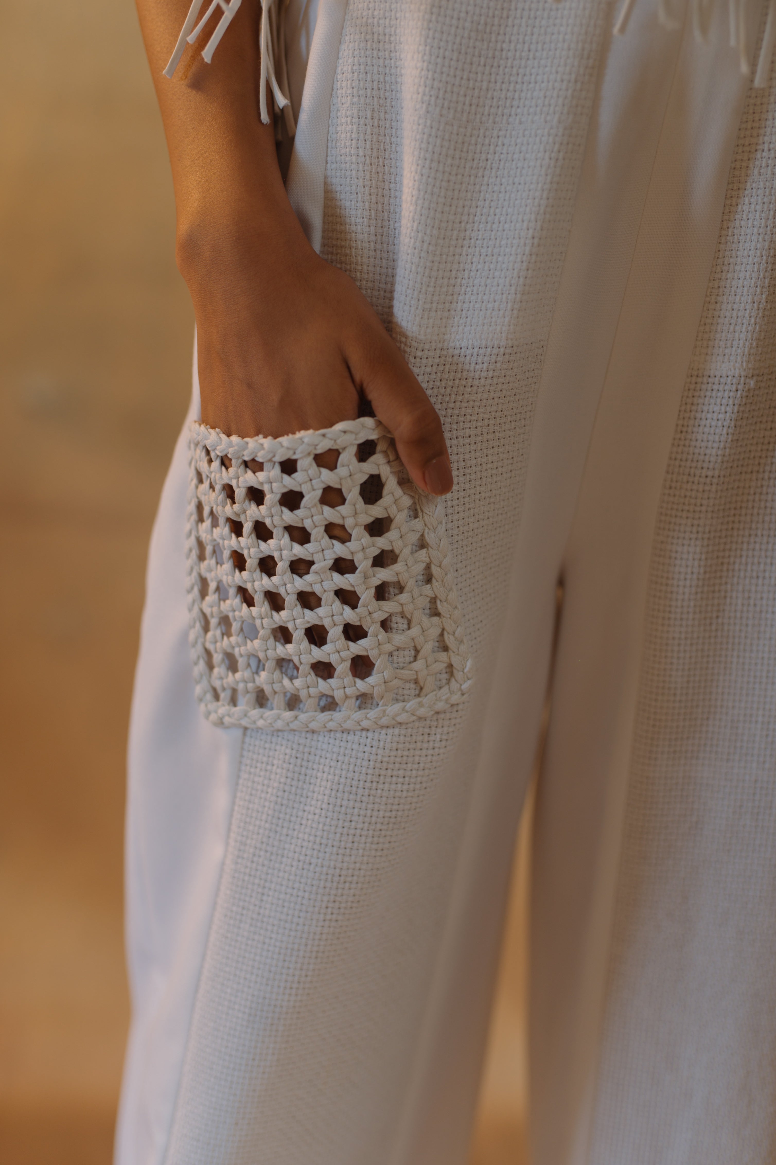 i am a cool pair of white straight pants crafted from a white suiting fabric featuring a hand woven pocket with fringe and braided straps – giving the perfect throwback to the boho era of style. the pants have a straight silhouette and feature panelled mesh material in between to match with the kurti top which comes with this as a set, or you can get me on my own too. the pants features a side zip, hook and back elastic ensuring easy wearability and supreme comfort.