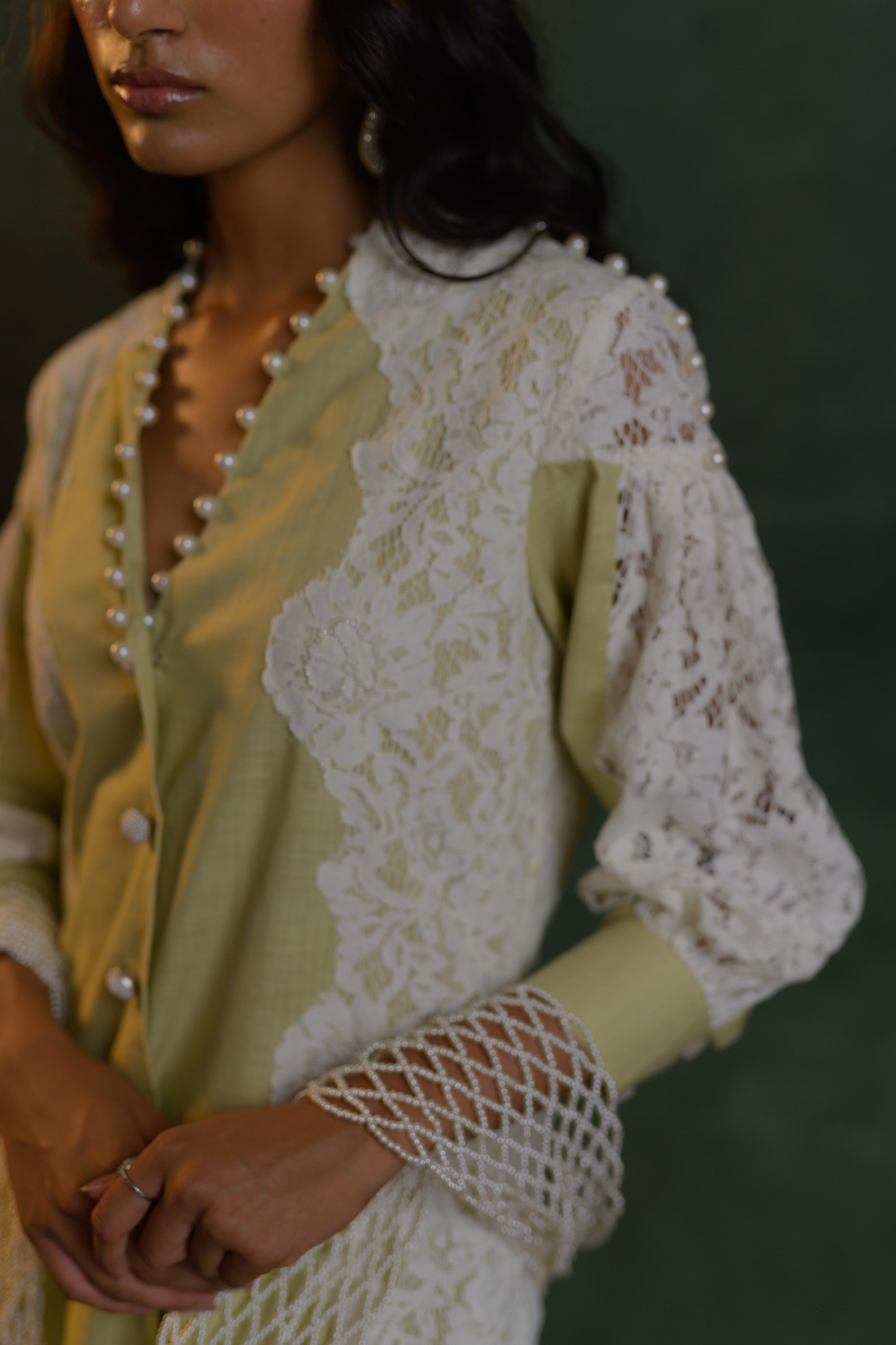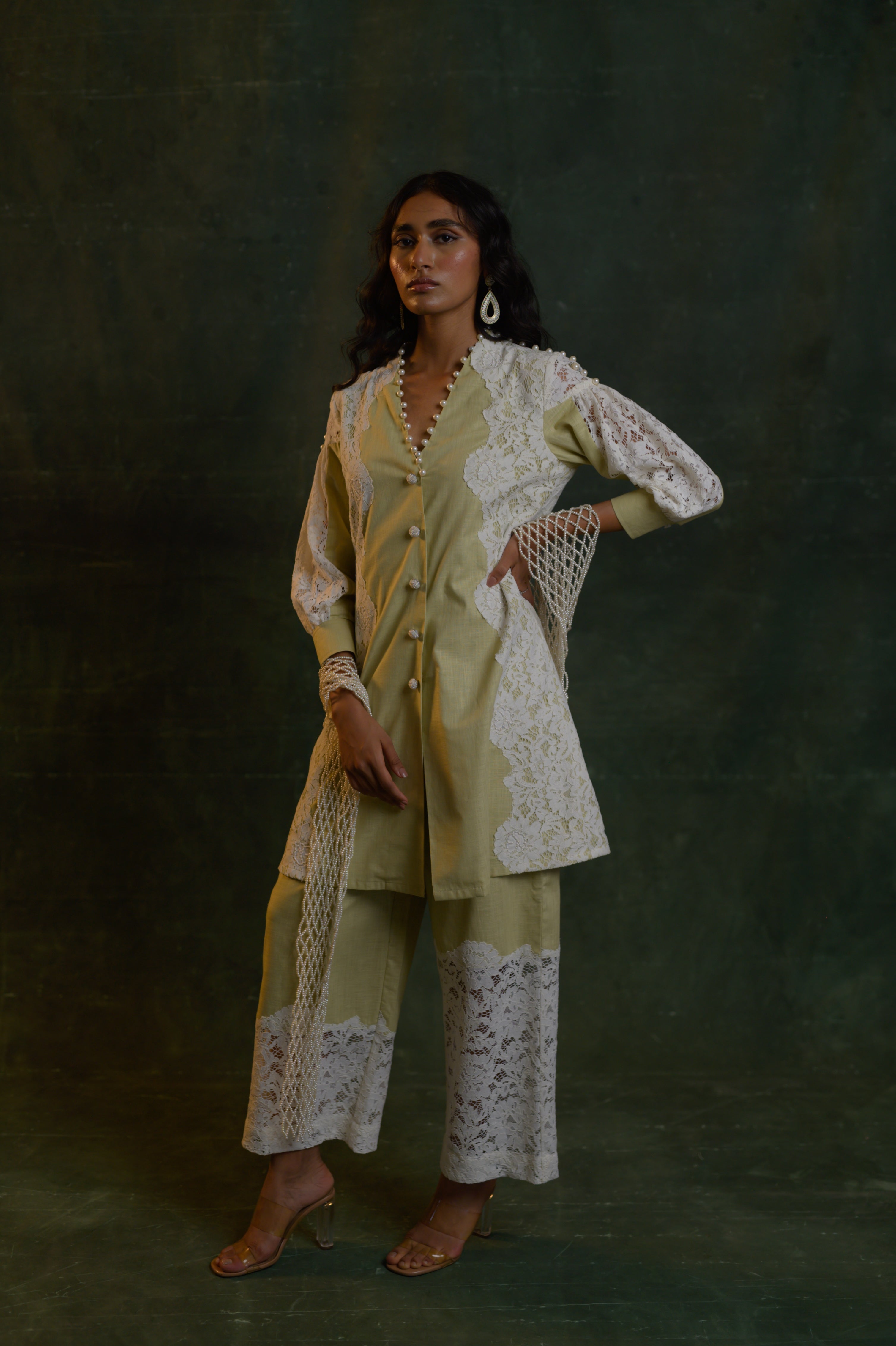 i am her nostalgia’s evergreen kurti set, an indo-western ensemble perfect for the festive season. i am also a great pick for any other reason you may have to dress up and feel good around the year, and for years on end! handcrafted out of a pure cotton linen fabric, i feel like a dream when you wear me. my lime green colour is so refreshing, and it’s an old-time favourite, one for the memories. you will also love my scallop cut lace patches all over the sides, which continues to the back, dotted with pearl detailing all over. my silhouette is stylish, my fit super comfortable. the pretty lace shows up on the 3/4th sleeves with a subtle puff and gathers. the sleeves also have a crisp cuff. other interesting details about me include pearl embroidered buttons, uneven lace patches on the pants, and the best part – i come with a beautifully hand embroidered pearl beaded stole, that can be carried forward and paired with your other outfits too! ps: to customise the length of the pant, whatsapp margin, they will sort you out.