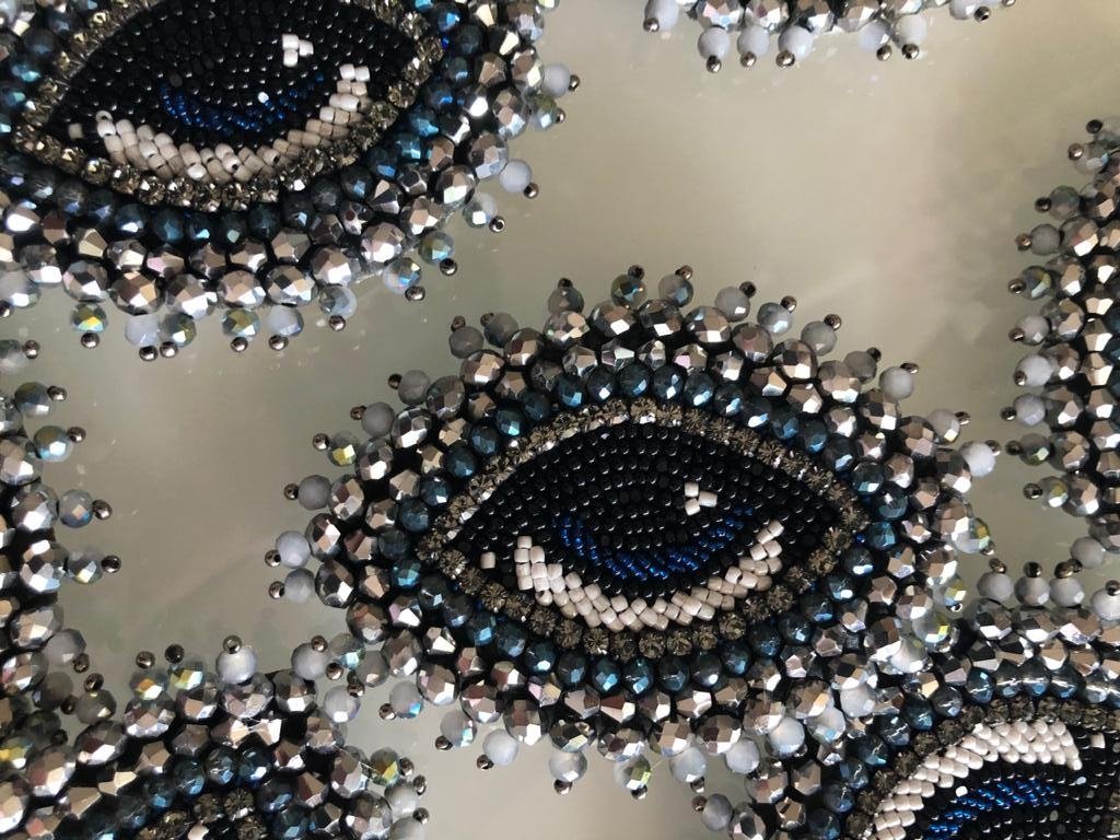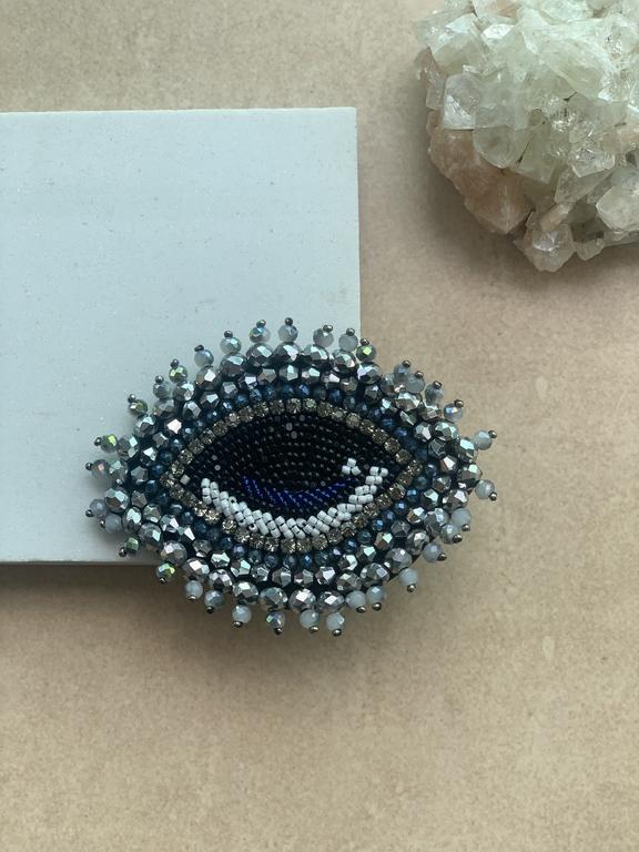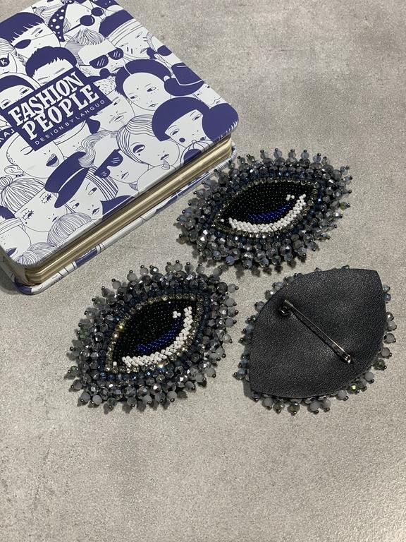 i am inspired by the all-favourite evil eye. but i have my own spin. i am made out of multiple colour beads and crystal stones. i am larger than your average brooch — i measure 3x2. 5 inches. my back has an artificial leather finish. i have a pin that will secure me onto many canvases.