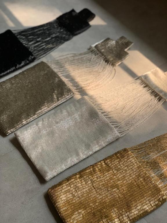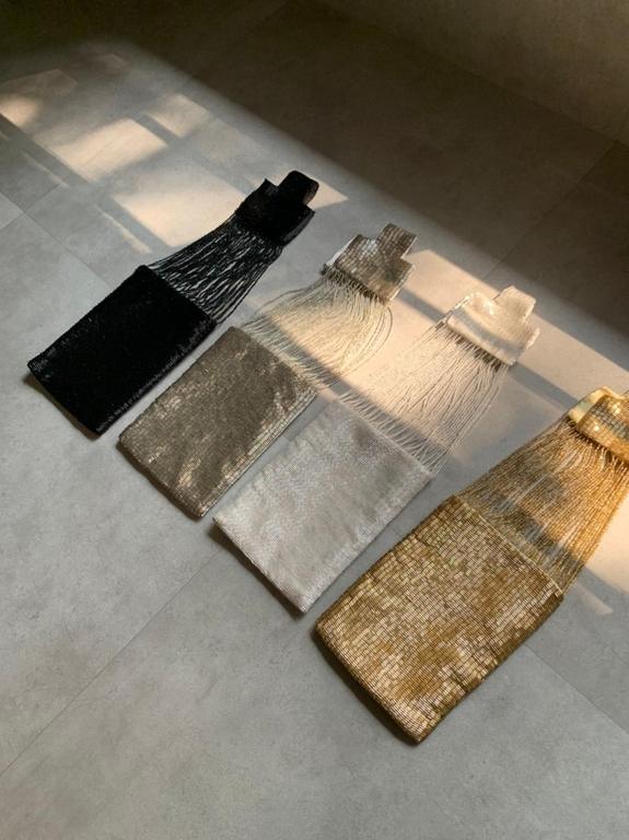 i am the kind of wrist candy you have been waiting for! i am a fully hand embroidered purse, top to bottom, made out of high quality bugle beads. yet i am extra light to carry. i am the ideal size to hold your key essentials: mask, sanitiser, phone, credit cards and makeup. i have a hidden magnetic button to close. i have a luxe satin finish inside the purse. i can also be custom made in any colour you like!