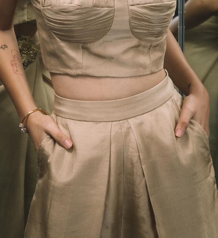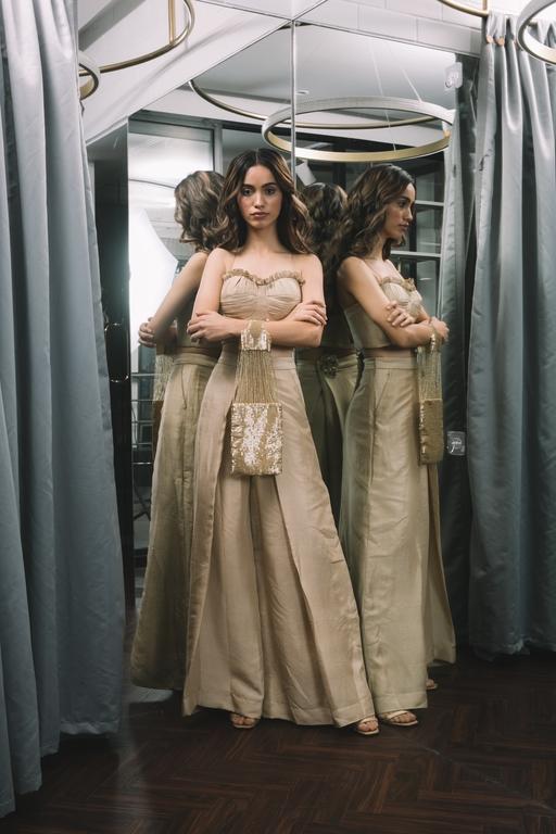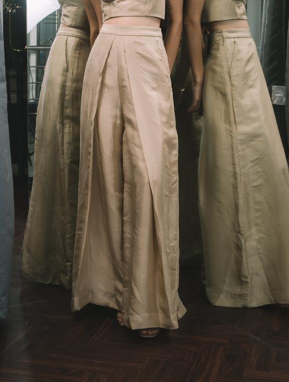 magic can be simple too, just like style can. just like i am. i am lovingly crafted out of the finest pure crepe fabric that feels super soft and luxe on the skin. i am a beautiful dusty gold. but i can be custom made in any colour. i am a of box pleated palazzo or flared pants. i have a belted waist and and a hook and zip on the side. i am classic, contemporary and cool, all at the same time