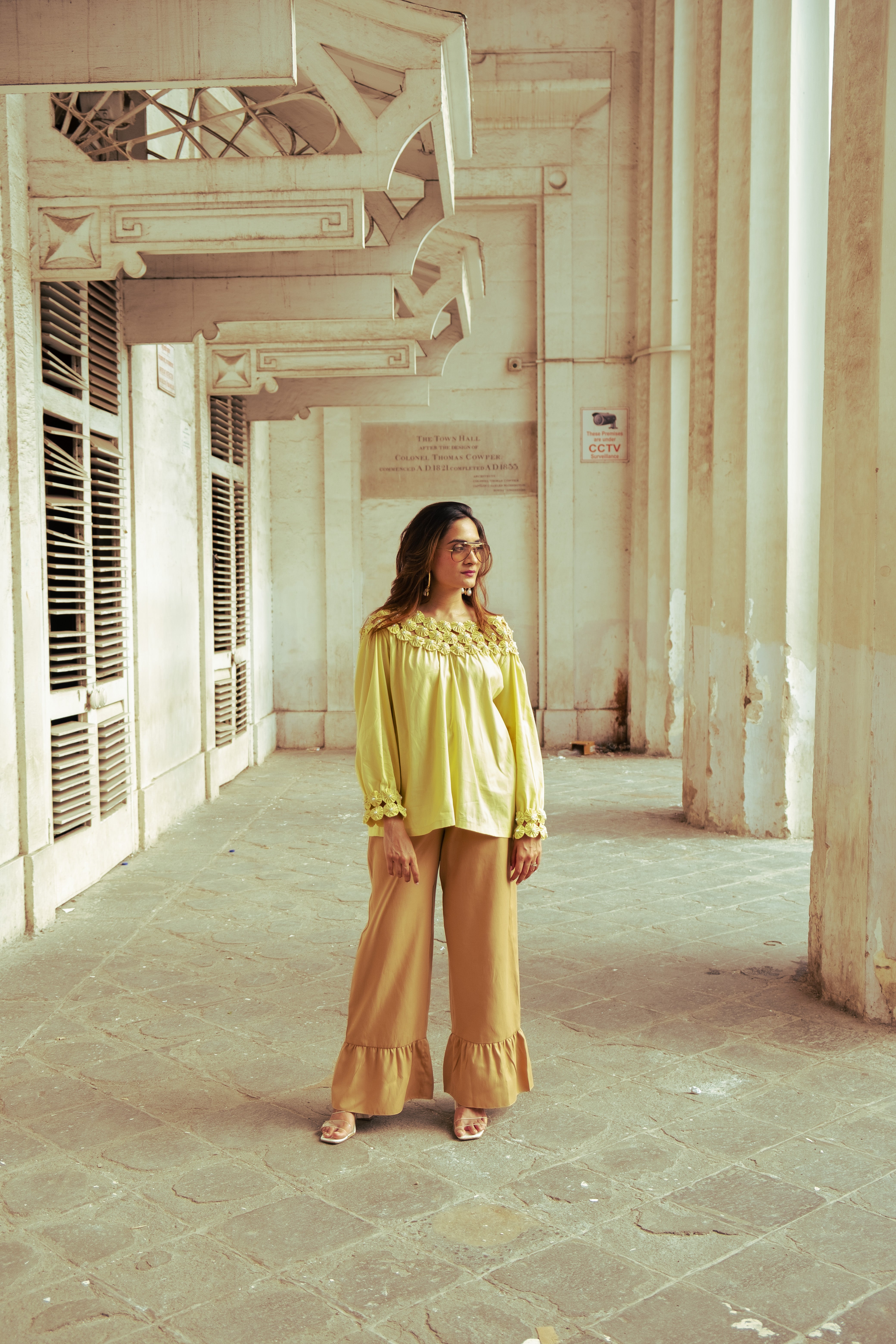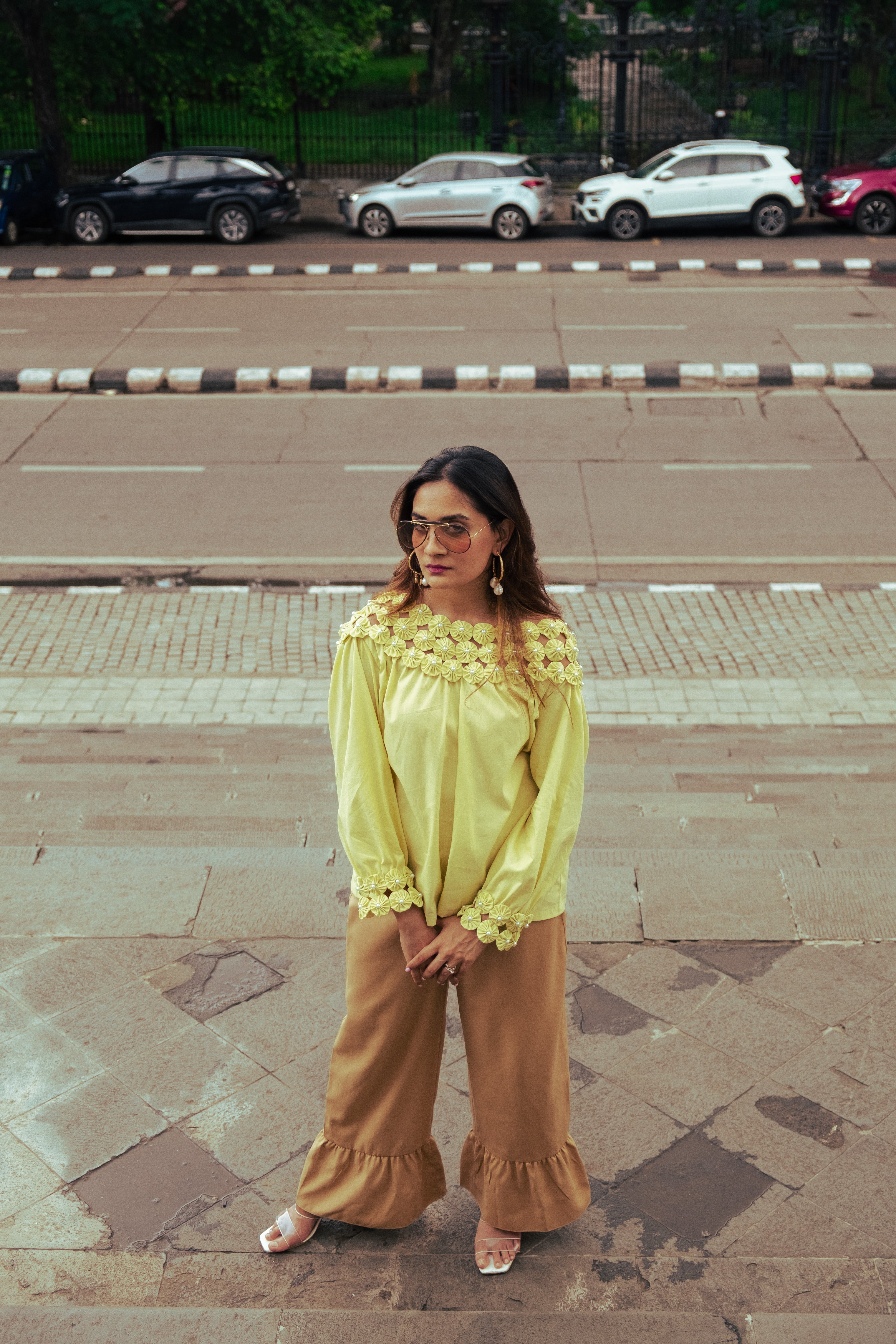 I’m the Flowerside Top — your daily dose of dopamine, disguised as an outfit. With my bright, mood-lifting hue and boxy silhouette, I bring a playful pop to your wardrobe without ever compromising on ease. I’m modest but modern, lightweight but full of texture, and designed to make “just another day” feel a little more considered. My neckline? Gently handcrafted for that subtle wink of detail. My sleeves? Framed with embellished cuffs that catch the light when you lift your latte. I’m that in-between piece you didn’t know you needed.
